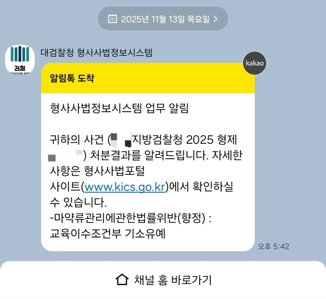 위 딸의 인생과 진심을 담은 의견서 제출 이후 검사실에서 나에게 직접 전화를 걸어와서, 아직 확정된 것은 아니지만 피의자에 대하여 교육이수조건부 기소유예 처분을 검토하고 있다고 하였고, 오늘 드디어 교육이수조건부 기소유예 처분을 받게 되었다.