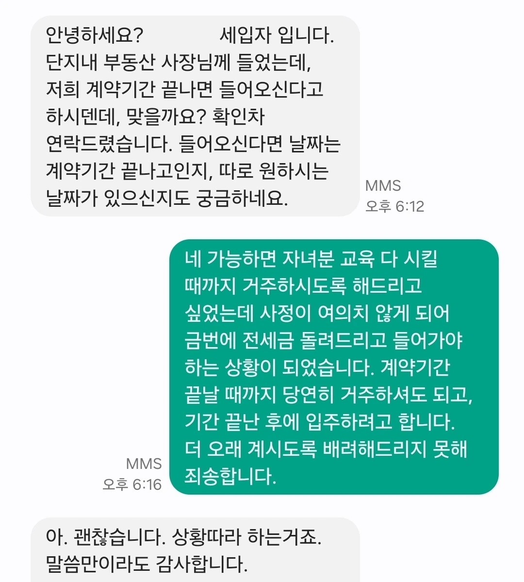 아래는 금번 이사를 앞두고 세입자와 나눈 대화인데, 더 배려해 드리지 못해 죄송하고 새로 가시는 곳에서 더욱 번창하시고 행복하시길 축복한다.