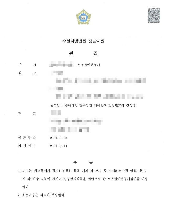 진정명의회복을원인으로한 소유권이전등기 이행 판결 선고 및 동 판결의 확정에 따라, 원고들은 별도의 추가 절차(?) 없이 피고가 참칭상속인으로서 경료한 원고들 상속지분 상당의 등기를 말소함과 동시에 곧바로 원고들 앞으로 본인들의 상속지분에 따른 상속등기를 경료 완료하였음은 물론이다.