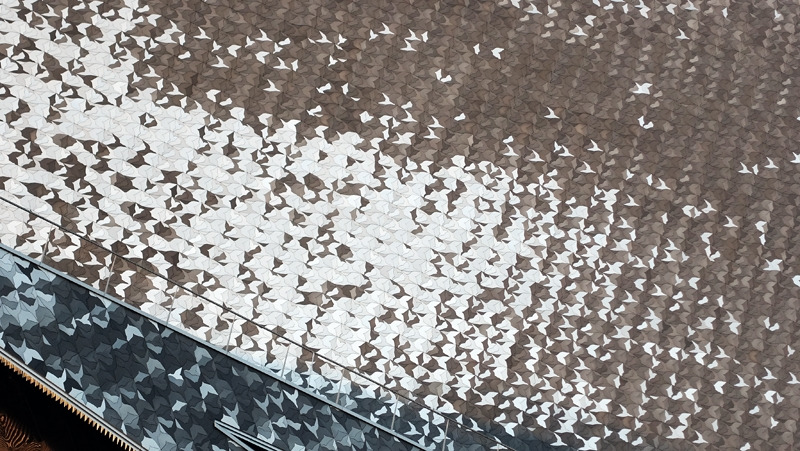 문제의 건물, 필하모니 드 파리는 멀리서부터 햇빛을 받아 반짝이는 모습이 예사롭지 않았다. 가까이 다가가니 반짝이는 것의 정체는 새 모양이었다. 새를 패턴화해서 건물 바깥을 완전히 회색의 새떼로 덮어놨다. 몇 가지 패턴 조각을 연결했는데 복잡하게 생긴 건물 전체를 덮으면서 아귀가 딱 맞게 하려면 고생 깨나 했을 것 같다. 건물이 워낙 독특한 모양이라 빛의 변화에 따라 시시각각 건물의 모습이 다르게 보인다.