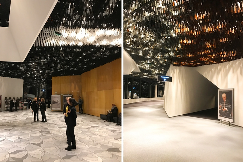 공연까지는 30분 남짓. 건물에 들어가서도 또다시 부지런히 계단을 오르내리고 모퉁이를 돌아 구석구석 필하모니 드 파리 탐방이 시작되었다. 실내에서도 천장에 눈이 갔다. 작은 금속 조각인지 플라스틱 조각을 천장에 가득 매달아 둔 것이 팔랑거린다. 조명이 부드럽게 일렁거리는 느낌이 좋았다. 위층 로비는 천장을 물결치는 갈빗살처럼 곡선 프레임을 씌워 놓았는데 꼭 악보의 오선 같기도 하고, 리듬감이 느껴져서 음악회장과 어울렸다.