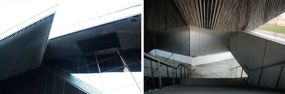 필하모니 드 파리 입구를 지나 건물을 돌면 라 빌레트 공원을 내려다보는 레스토랑이 있다. 레스토랑 쪽 처마 밑으로 지붕에서 내려온 새 모양 패턴과 오른쪽 금속 바구니 패턴이 만나는 곳도 섬세하게 그러데이션을 주었다.