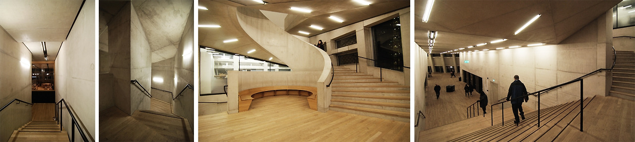 건물 뒤쪽의 뾰족하게 나간 부분이 대부분 계단이나 로비인 것 같았는데, 가로로 긴 창들이 휴식공간과 채광을 만들어 준다. 밖에서 보면 빛이 새어 나오는 오브제가 되는 셈이다. 지하로 내려가면서 외부에 가까웠던 계단은 곡선을 그리면서 점점 안으로 들어온다. 자연스럽게 건물 내부로 들어온 느낌이다.
