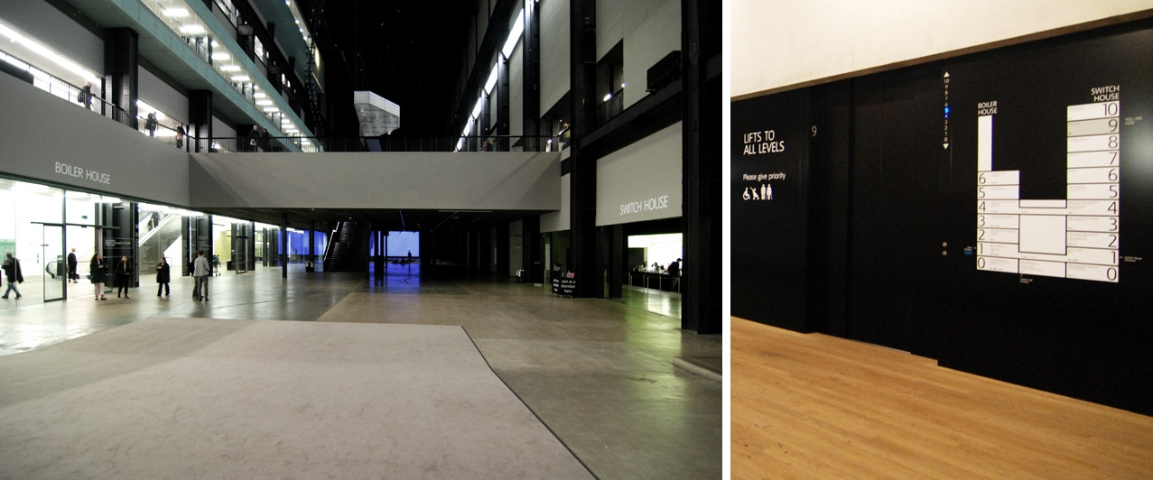 테이트 모던은 부족한 전시공간을 보충하기 위해 기존 건물 뒤쪽으로 10층짜리 건물을 새로 지어 올렸다. 내 눈엔 상자를 살짝 찌그러뜨린 것처럼 보였는데, 해설은 피라미드 모양이라고들 한다. 증축한 건물인 스위치 하우스는 밀레니엄 브리지 쪽에서는 윗부분만 살짝 보인다. 화력발전소의 겉모습을 그대로 가지고 있는 테이트 모던 본관과 자연스럽게 어우러지는 벽돌 건물이다. 내부에서는 가장 큰 공간이자 로비 역할을 하는 중심부의 터빈 홀을 중심으로 기존 건물과 신축 건물이 서로 마주보고 있다.