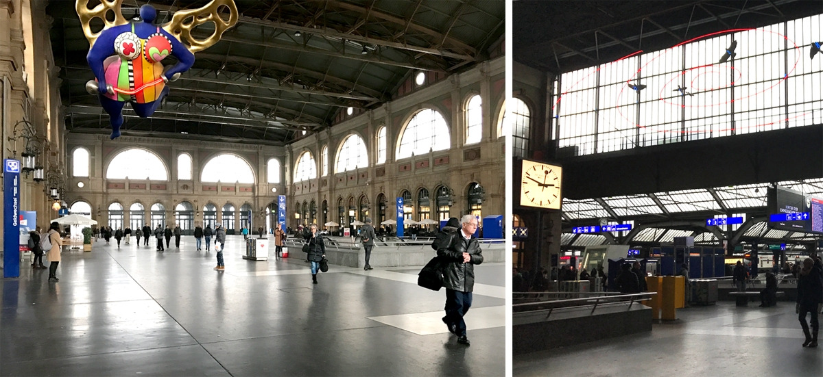 기차역은 머무는 공간이 아니라 흘러가는 공간이다. 모두가 움직이는 곳에서 우두커니 서있으면 이방인이라는 존재감이 더 크게 느껴진다. 혼자 남아 천천히 둘러보니 비로소 뻥 뚫린 역사 안이 서서히 눈에 들어온다. 잡지 가판대와 빵집을 구경하면서, 괜히 누구처럼 역사를 왔다갔다 오르락내리락해본다. 익숙한 색감과 모양의 조각 작품이 하늘을 날고 있다. 그 유명한 스위스 몬데인 시계도 보인다. 아이폰 화면의 시계 디자인과의 저작권 소송에서 이겼다는 그 시계다.