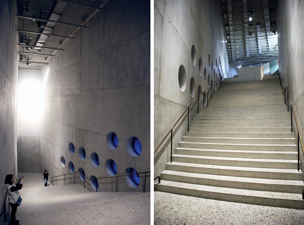 실은 우리뿐만 아니라 관람객들 모두가 계단 위에서 아래에서 사진을 찍기 바쁘다. 위로 올라갈수록 넓어지는 계단은 아래에서 보면 직선으로 보인다. 반대로 위에서 내려다보면 실제보다 훨씬 공간을 넓고 깊어 보이게 하는 효과가 있었다. 긴 계단과 단순한 넓은 벽, 계단에 맞춰 규칙적으로 뚫린 동그란 창문들. 단순하지만 잊히지 않을 계단이 또 하나 추가됐다.