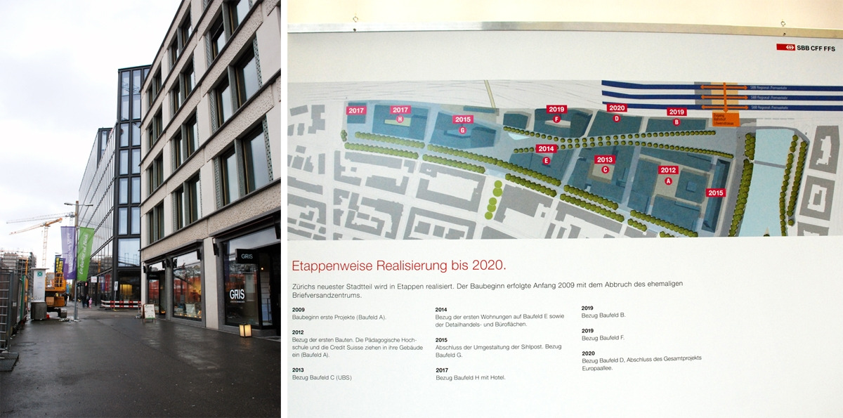 취리히 중앙역 근처에 재개발 중인 유로팔레(Europaallee) 지역을 보기 위해서다. 유로팔레 지역에는 취리히 교육대학부터 이어지는 주거, 업무, 상업 복합단지가 들어서는 중이라고 한다. 유명 건축가들이 대거 참여하고 있다는데, 나중에 건축가 남편이 담아 온 사진을 보니 좋은 건 둘째치고 전체 규모가 꽤 크고 큰 블록들 사이사이 골목골목을 걸어 다녀야 하는 곳이었다. 나를 중앙역에 버려주고 간 것이 진심으로 고맙게 느껴졌다;;;