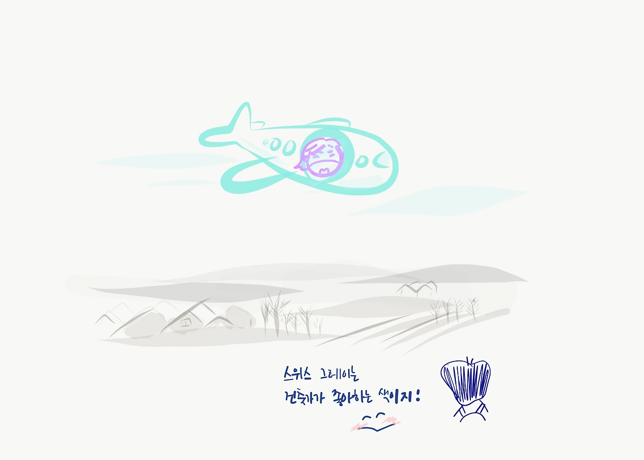 그러고 보니 파리와 런던을 거쳐 온 여행길에서 비바람은 만났어도 눈 구경은 스위스가 처음이다. 취리히로 오는 비행기에서 내려다본 눈 덮인 풍경을 떠올려 본다. 그림엽서처럼 눈 덮인 풍경은, 스위스의 상징 같은 모습이었다. 하얀 눈이 덮어버린 자리에는 가장 단순한 선과 면과 색만이 남아있었다. 눈 덮인, 혹은 눈이 조금 녹은 듯한 연회색과 연갈색, 눈이 덮여 더 선명해진 나무와 지붕과 들판의 선과 면들 말이다.
