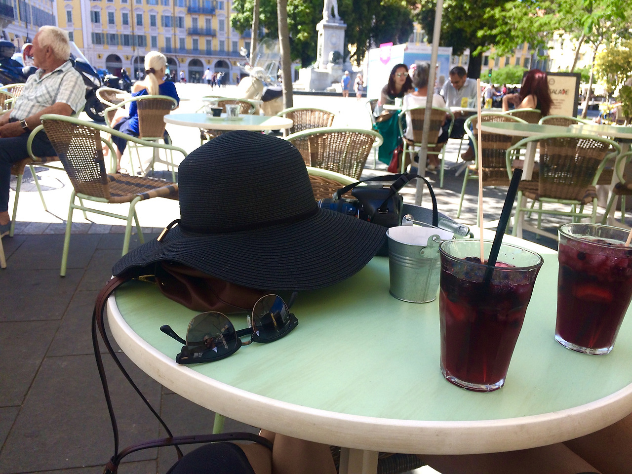 일단 시원한 뭔가를 좀 마실까? 그래. 친구와 나는 광장 쪽으로 걸어가 열려있는 노천카페 아무 곳을 찾아 들어갔고, 이내 흰색 파라솔 밑에 자리를 잡았다. 달달하고 시원하게 목을 축일 음료가 있을까, 둘러보니 사람들 모두 짙은 보라색의 샹그리아에 빨대를 꽂아 마시고 있었다. 오호라, 테이블 위에 메뉴판은 보지도 않고 다가오는 웨이터를 향해 바로 주문을 했다. 쥬 부 비앙 두 샹그리아, 실 부 쁠레.