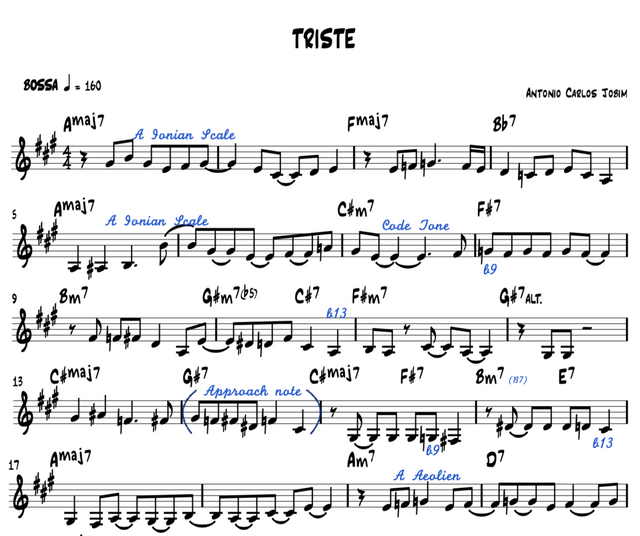 Dianne Reeves 와 같이 캐릭터가 강한 여성 보컬같은 경우 종종 카피 추천이 되지 않곤 하는데 이유로는 여러가지가 있겠지만, 다 제치고 너무나 사랑하는 뮤지션이기 때문에 학부생때 대부분 그녀의 음악을 듣고 솔로 분석을 하며 시간을 보냈다. 'TRISTE' 는 그 중 하나로 쉽게 볼 수 있도록 예시로 만들어 놓은 Transcription 이다.