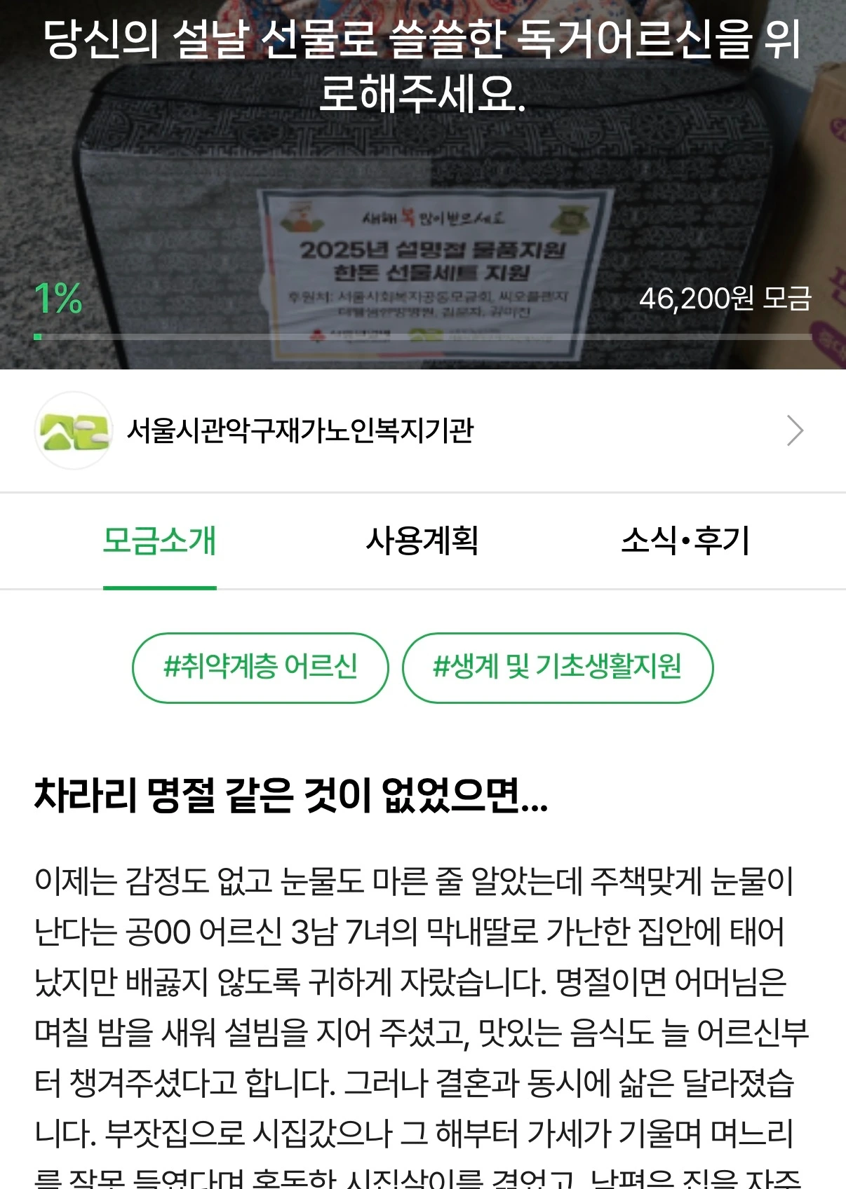 관악구에서 각자의 사연으로 혼자 지내는 어르신들께 설 선물을 전하는 기부에 참여하였습니다.