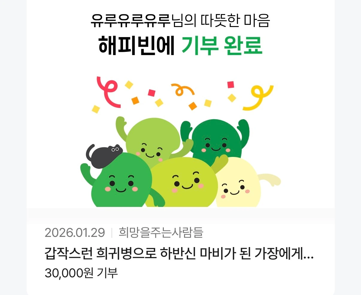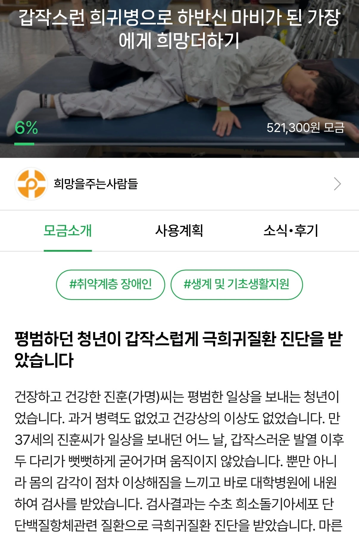 갑작스런 희귀병으로 하반신마비가 된 가장의 재활을 돕는 곳에 기부하였습니다.