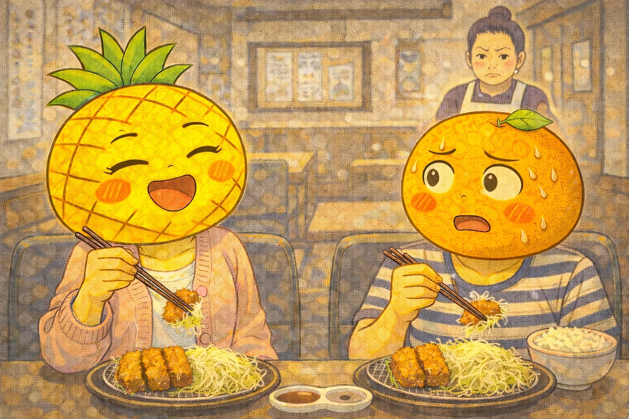 실처럼 썰린 양배추 위의 노란 소스에서는 깨 맛이 났다. 눈이 번쩍 뜨이는 맛이었다. 두꺼운 튀김옷은 겉보기와 달리 파삭하면서 부드러웠다. 깨를 간 후 섞은 갈색 소스에 돈까스를 찍어먹자 절로 탄성이 나왔다. 미소 된장국을 후루룩 마시며 감귤에게 웃어보였다.
