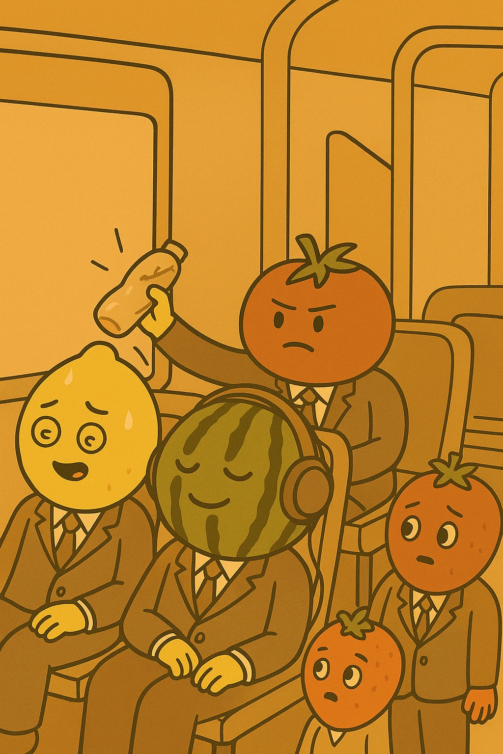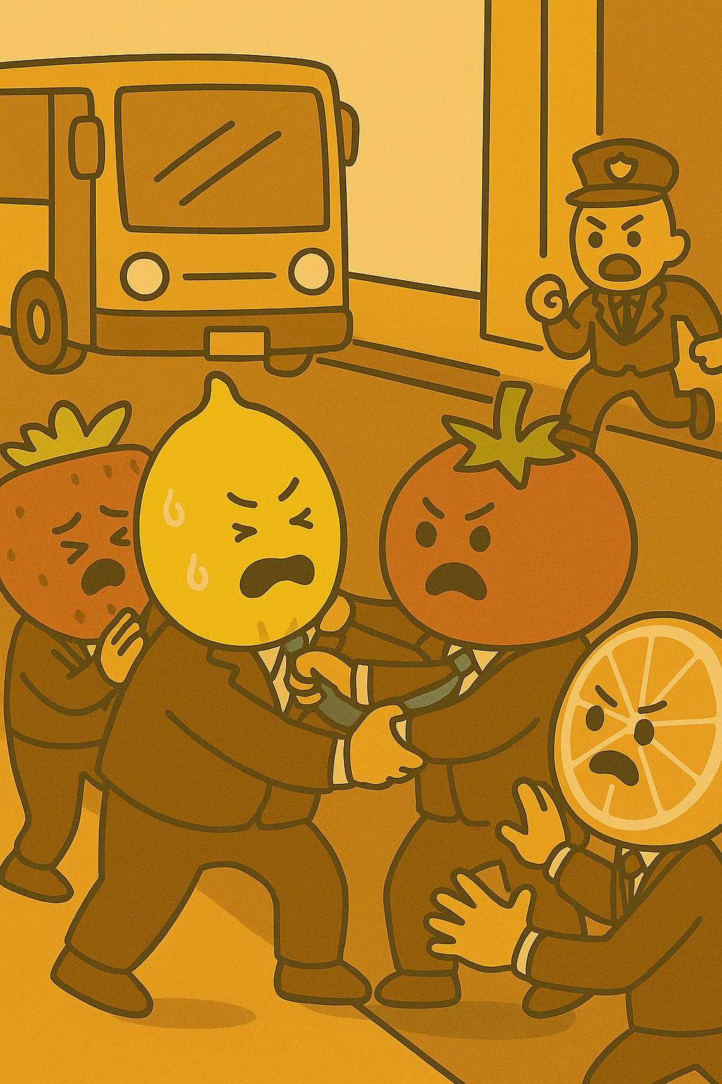 레몬 상무를 태우고 버스가 다시 출발했다. 뒷자리에 앉아 있던 토마토 전무는 레몬 상무의 만행에 심기가 불편했다. 토마토 전무는 모두가 보는 앞에서 레몬 상무에게 훈계를 시작했다. 들고 있던 빈 페트병을 휘두르며 새끼 상무로서의 몸가짐에 대한 일장 연설을 시작했다. 페트병으로 어깨를 탁탁 맞은 레몬 상무의 얼굴이 벌겋게 달아오르기 시작했다. 둘의 목소리는 점점 커졌다. 옆의 딸기 상무, 자몽 상무는 둘을 말리기 시작했다.