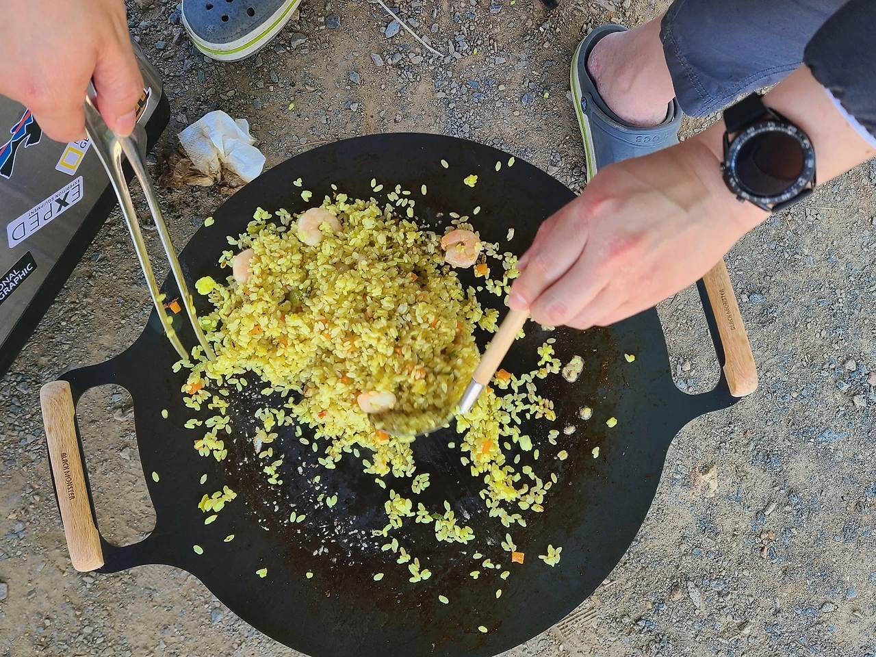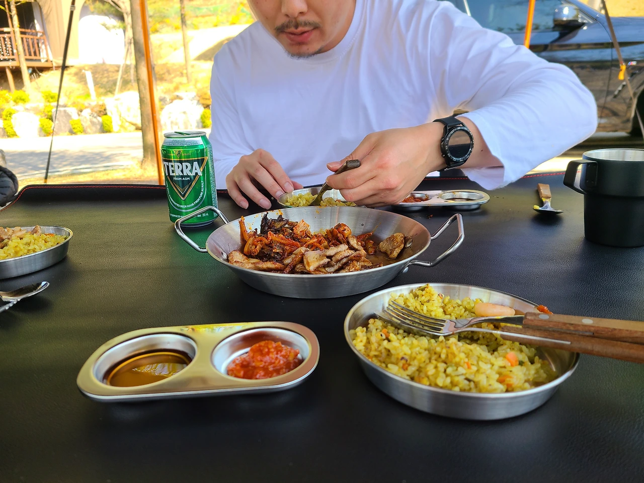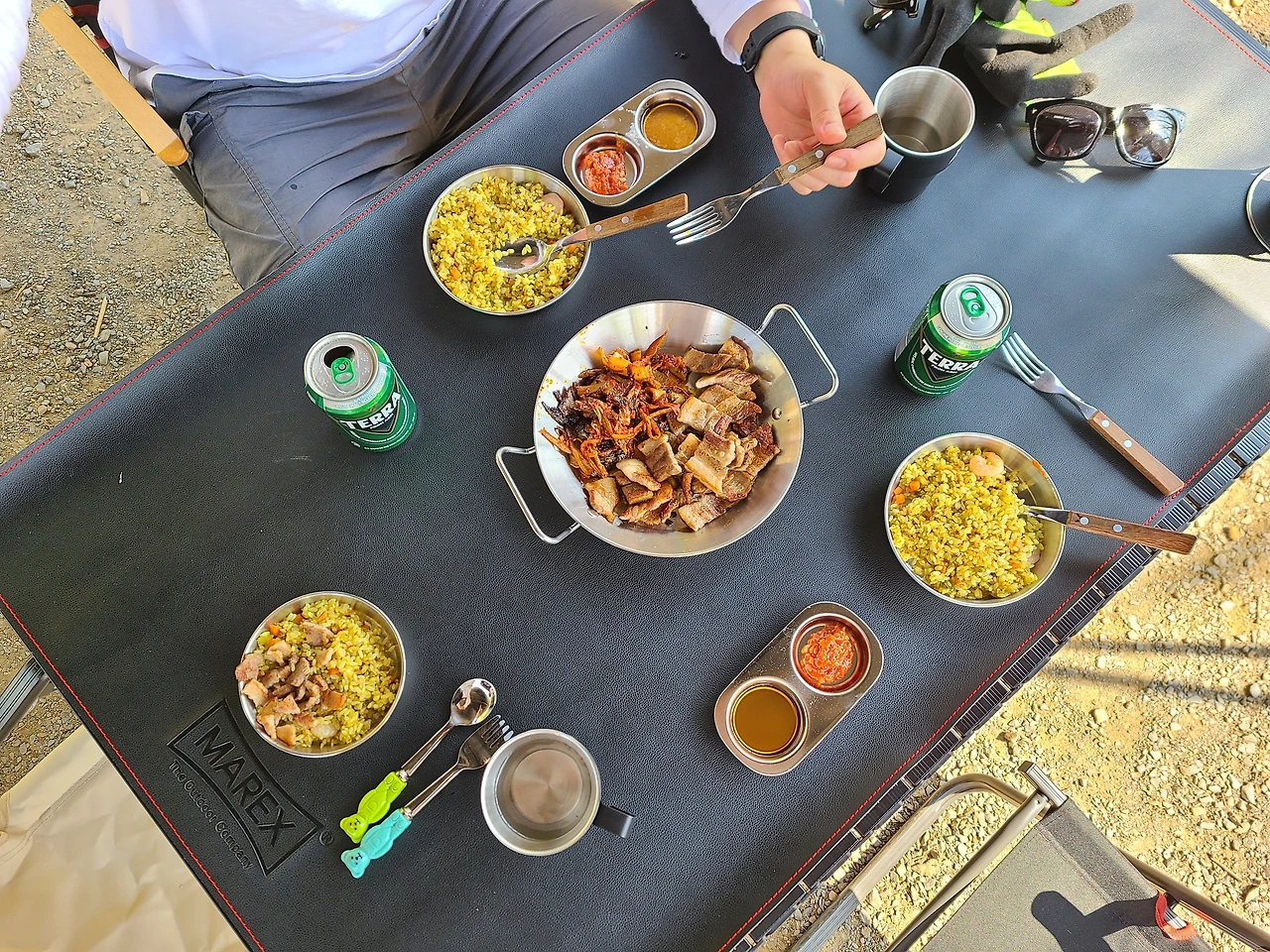 오늘은 무박인 데다 장비 테스트만 해보기로 한 것이 아닌가. 대충 마무리 정리를 끝내고 늦은 점심을 먹기로 했다. 간단하게 냉동 볶음밥과 삼겹살을 지글지글 그리들에 구웠다. 그리들 첫 사용이었는데 화력이 너무 세니 잠깐 고개를 돌린 사이 삼겹살이 베이컨으로 변신을 시도하고 있었다.