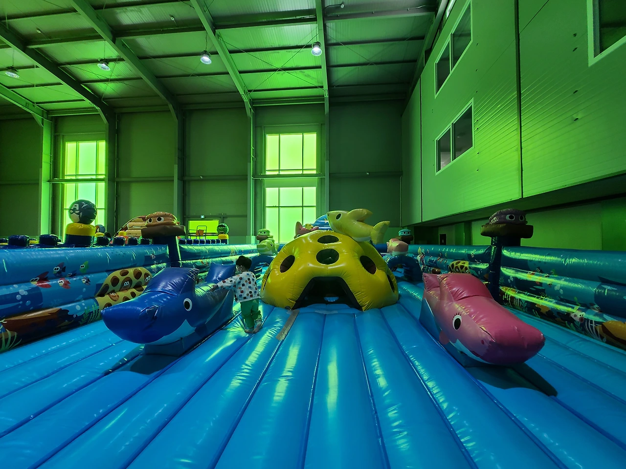 그동안 사 모았던 금쪽같은 캠핑 장비들과 음식 재료들을 꺼내 데크 위에 올려놓으니 준이가 빨리 놀고 싶다고 매달리기 시작했다. 아이의 기다림은 10분을 넘기기 어렵다는 걸 알고 있기에, 남편이 텐트와 타프를 치는 동안 나와 준이는 에어바운스가 있는 실내 오락실에 갔다 오기로 했다.