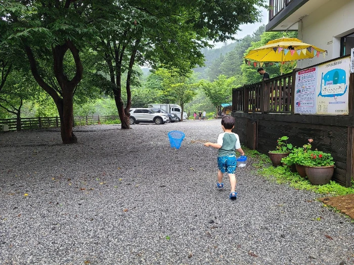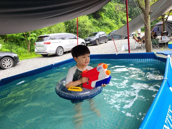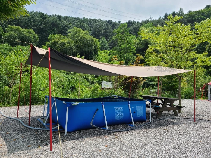 수영장은 아이들 3~4명만 들어가도 꽉 차는 크기의 어린이용 풀장이었다. 블로그 리뷰에서 봤던 크기와 너무 달라 실망했지만 캠핑장 뒤편에 큰 계곡이 있어서 어린아이들을 위한 수영장으로 만들어 주신 것 같았다.