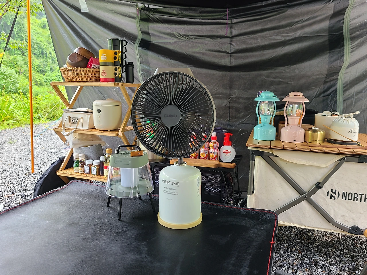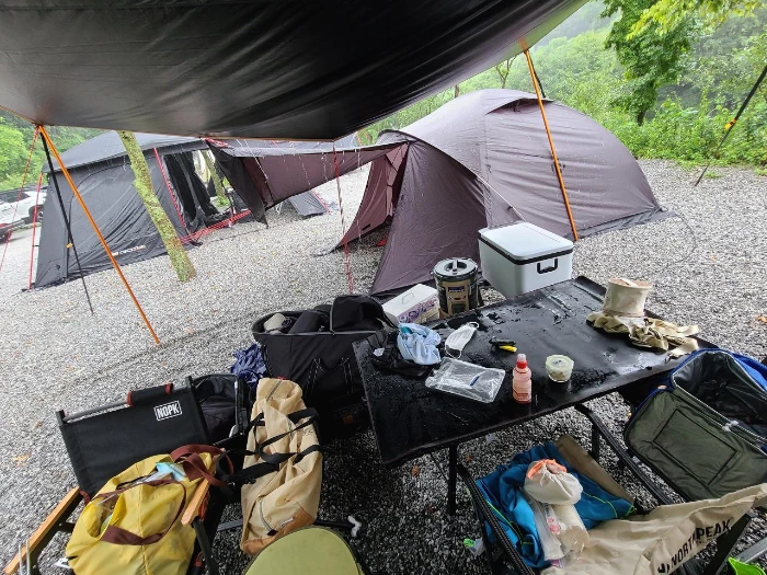 하늘에 구멍이 난 것처럼 비가 쏟아져서 피칭을 제대로 못한 탓에 타프는 한쪽이 기울어져서 무너지기 1 초각이었다. 나는 타프 아래에 테이블을 펼치고 비에 젖은 짐들을 모아 놓고 남편은 제대로 타프와 텐트를 피칭하기 시작했다.