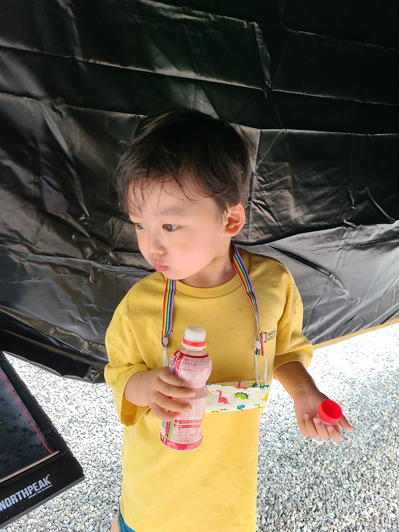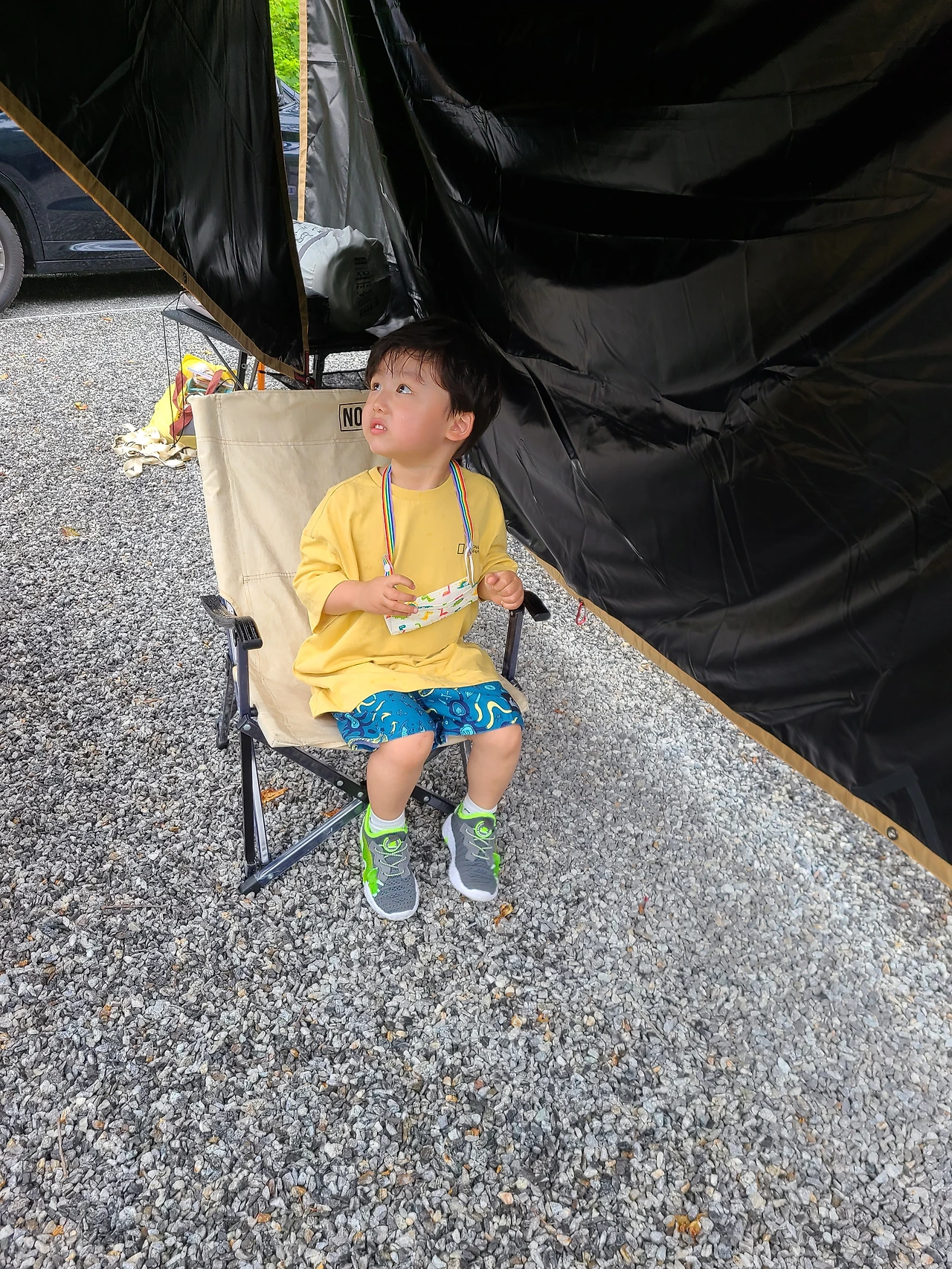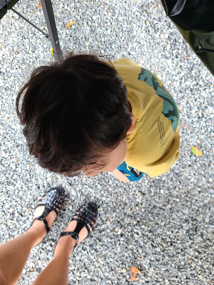 눈을 뜨고 있기 조차 어려운 상황에 남편은 텐트와 타프를 피칭했고 나는 우왕좌왕하며 대충 정리를 하는데 사이트 코 앞에 수영장이 있으니 준이는 물놀이하고 싶다고 했다.