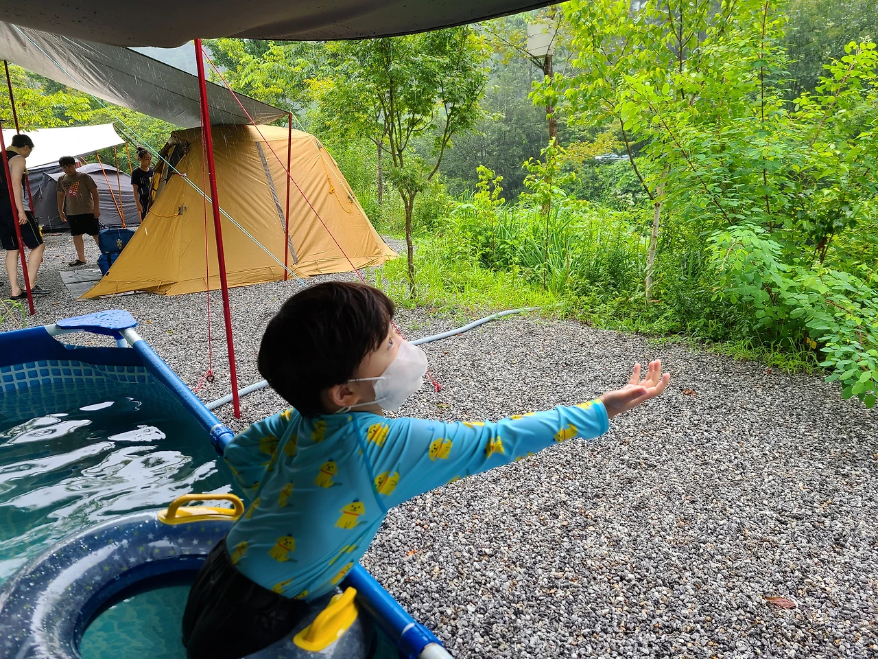 어차피 젖은 옷, 비 맞으며 가만히 있는 것보다 물놀이하는 것이 더 낫겠다 싶어 준이를 데리고 풀장으로 갔다. 남편은 외롭게 홀로 텐트를 마무리하기로 했다.