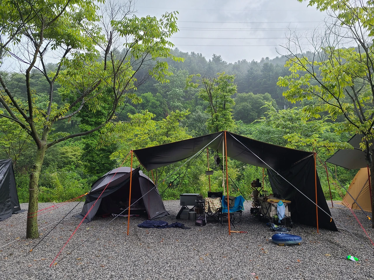 캠핑장에 도착했을 땐 비가 그쳐서 다행이다 생각했는데 사이트 앞에서 짐을 내리자마자 미친 듯이 하늘에서 폭우가 쏟아지기 시작했다. 그냥 막 쏟아졌다.