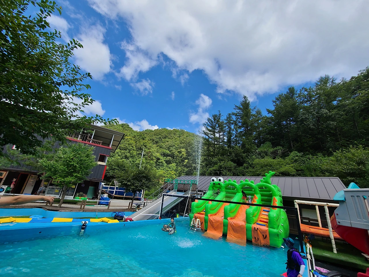 작은 놀이터 옆에 있는 수영장에는 미끄럼틀 에어바운스가 있었고 기존에 미끄럼틀로 사용한 것 같은 작은 수영장에는 유아 풀장을 따로 있었다.