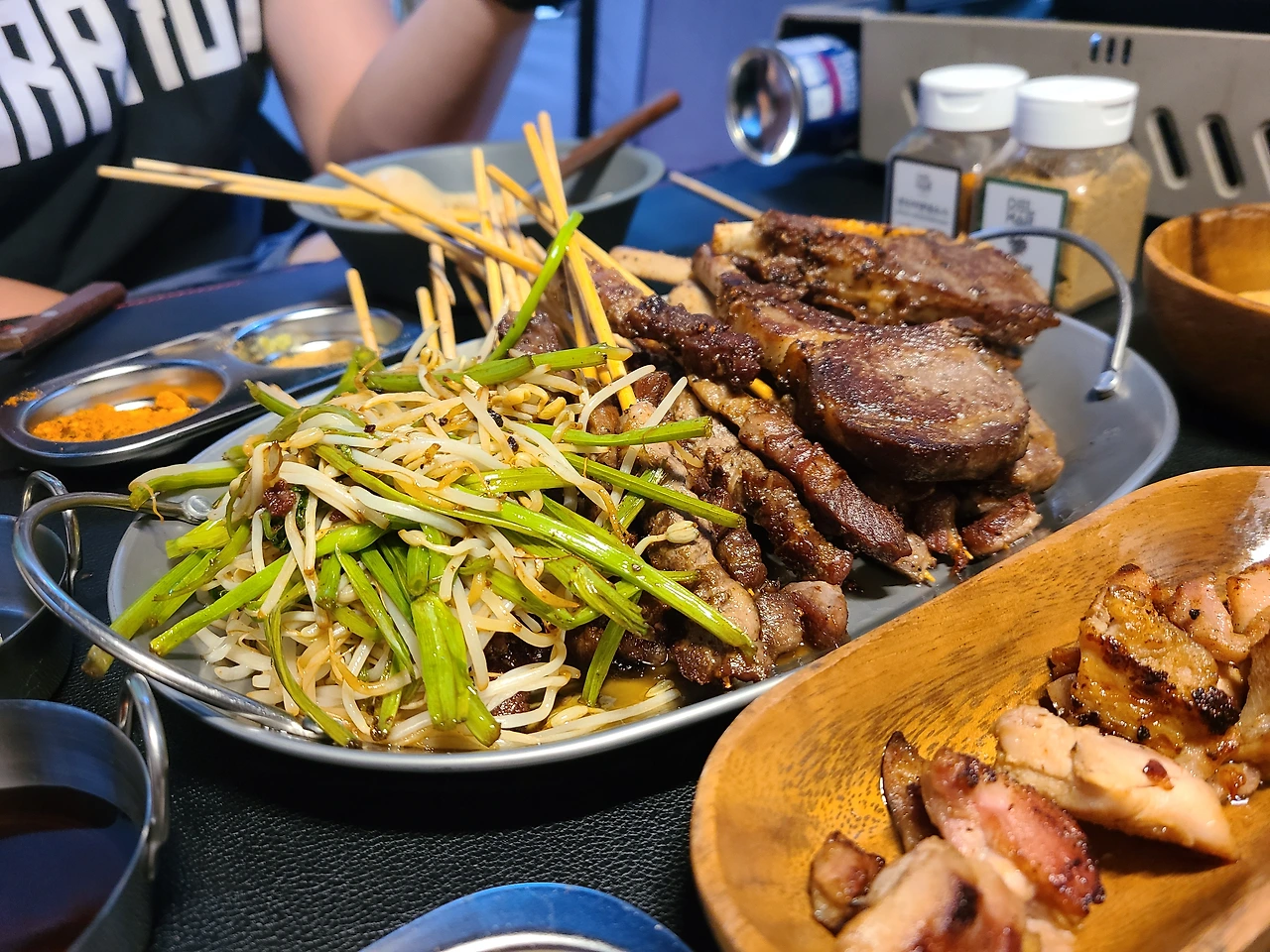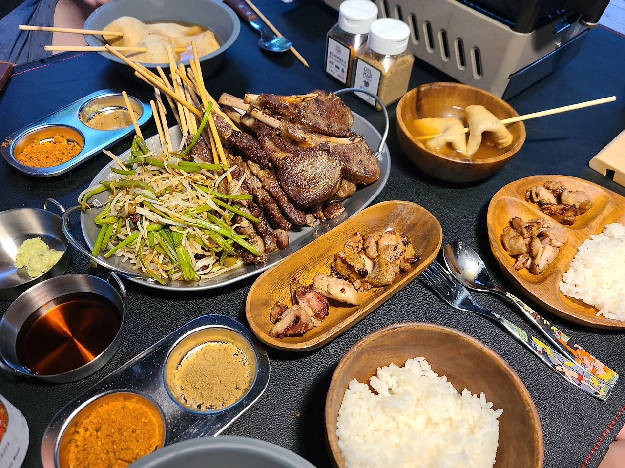 미리 마리네이드를 해둔 양갈비를 그리들에 굽고 준이가 먹을 간장 닭갈비도 구웠다. 물놀이를 많이 해서 배가 너무 고프다는 남편의 최애 음식인 꼬치어묵도 함께 준비했더니 테이블에 음식들로 가득 찼다.