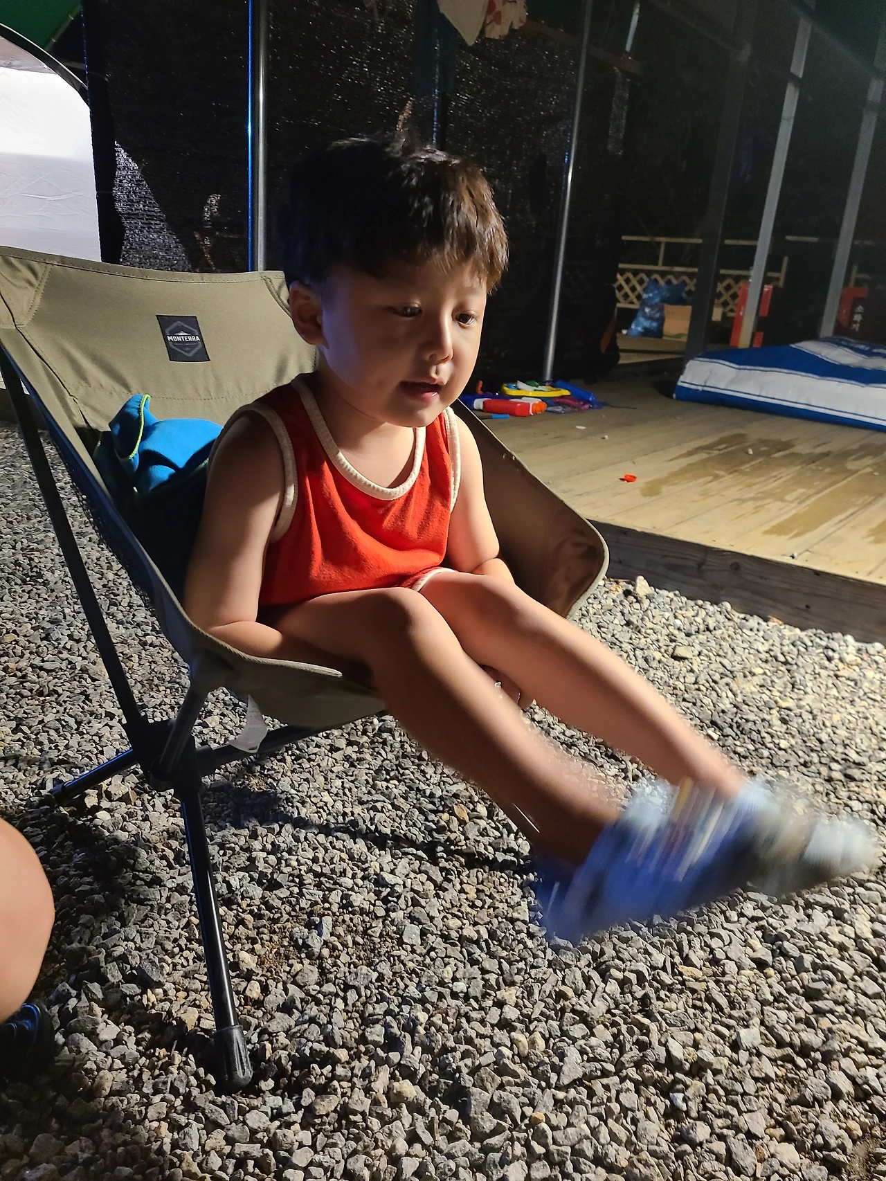 5살의 지치지 않는 무한 체력을 소진하기엔 물놀이만 하게 없다. 1시간 넘게 물놀이를 한 준이는 밥을 먹으면서도 눈을 끔벅끔벅거린다. 졸린 준이는 밥을 다 먹었다며 텐트 안에 있겠다고 휴대용 선풍기를 들고 자진해서 들어갔다.