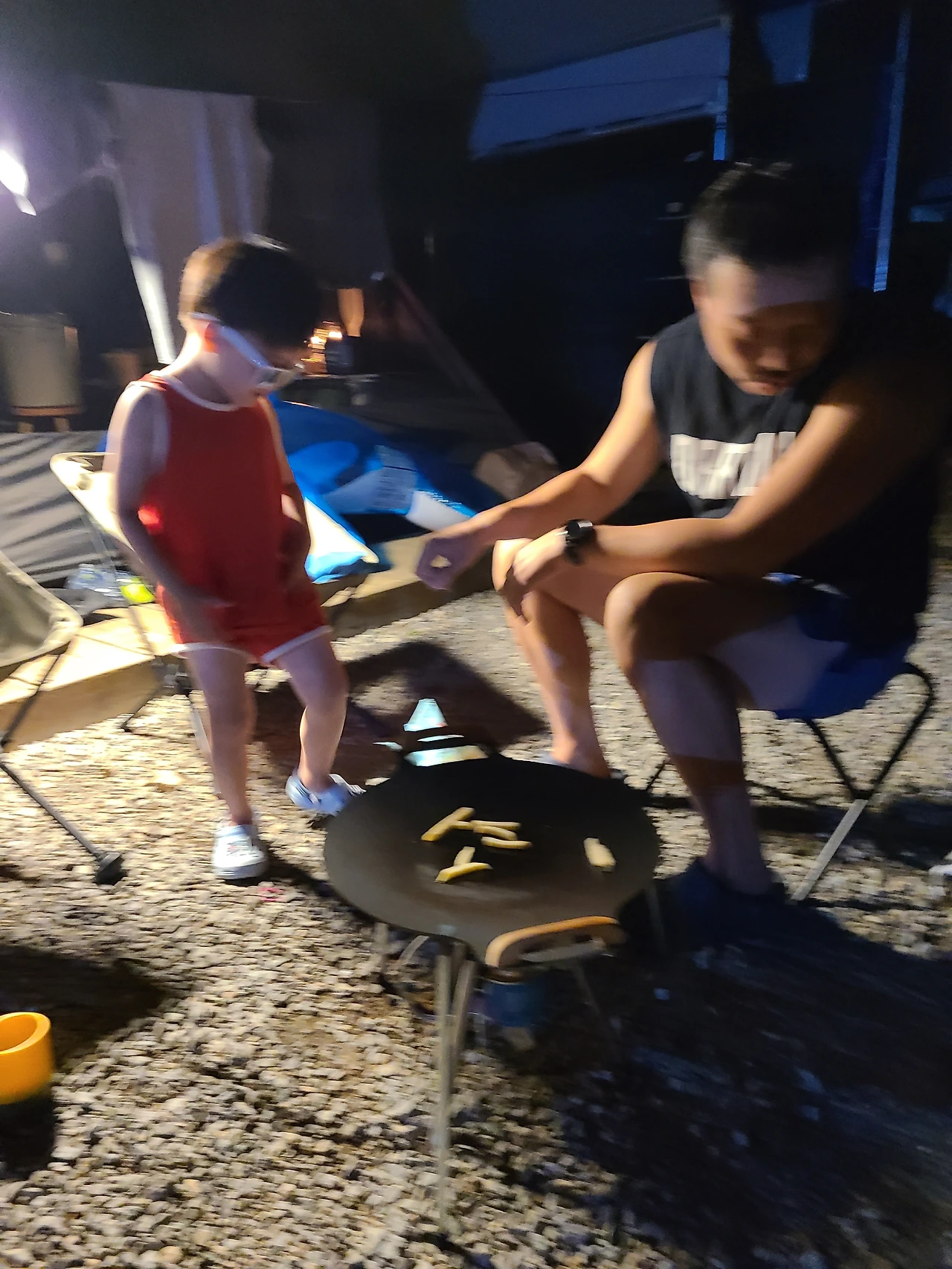 우리 세 식구는 그리들 앞에 둘러앉아 맛있는 감자튀김이 되는 순간을 지켜보았다. 기름이 튀니 가까이 가지 말라고 했더니 준이는 텐트에 들어가서는 자기 선글라스를 쓰고는 나타났다.