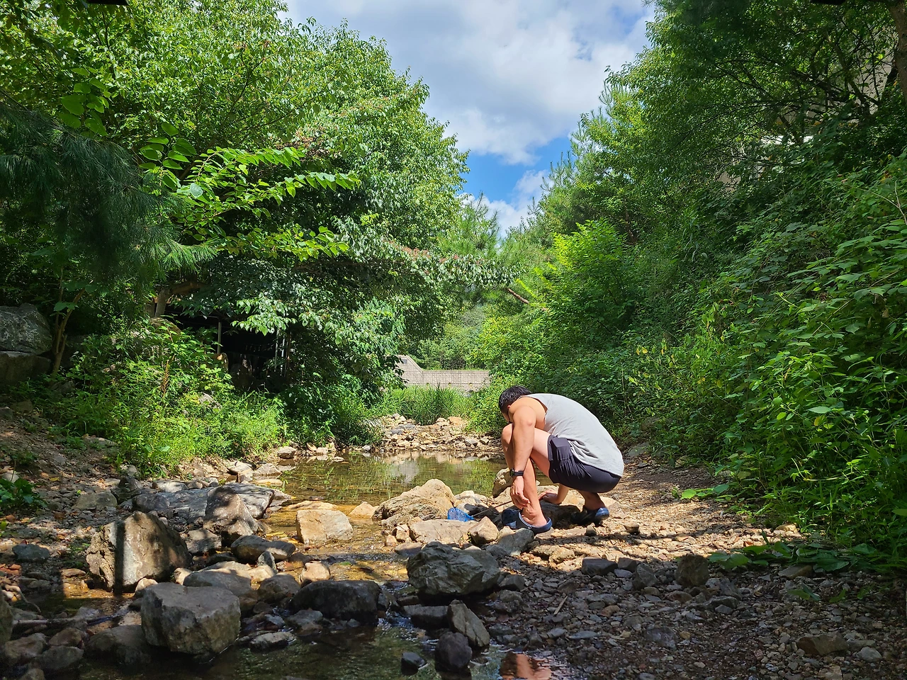 채집통 가득 물고기와 개구리를 잡고는 뿌듯했는지 함박웃음을 짓더니 다시 물놀이를 하겠다고 수영장으로 뛰어가는 무한 체력의 5살이다. 그 체력이 발산될 때마다 나와 남편은 눈치싸움을 했다. 이번엔 누가 수영장으로 갈 것인가.