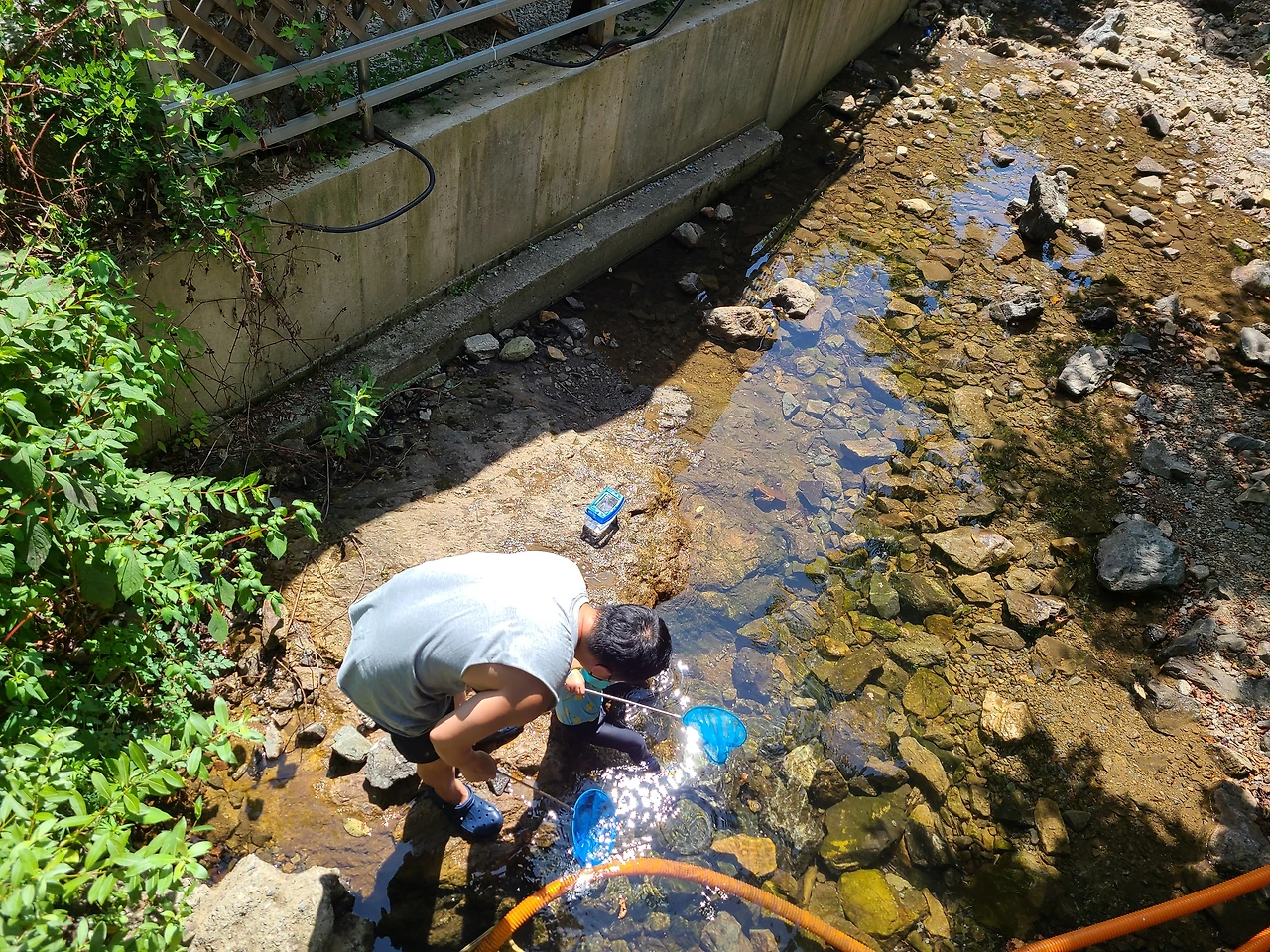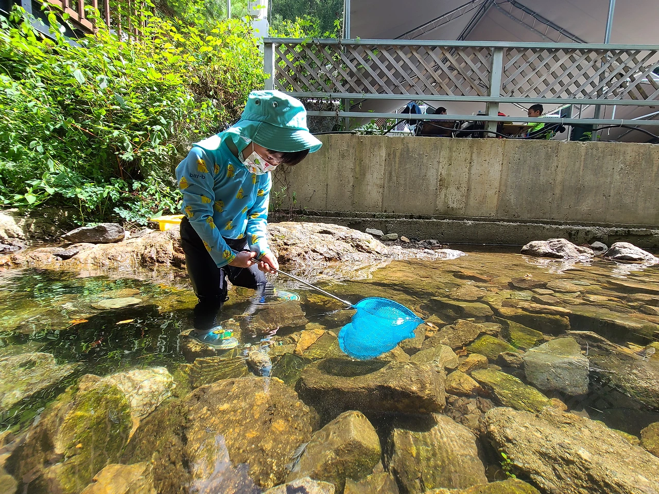 세 식구가 달달하게 낮잠을 자고 일어나서 최상의 컨디션으로 캠핑장에 다리 아래 있는 작은 계곡에서 물고기 잡기를 했다. 계곡 물이 많은 편이 아니라서 물고기가 없을 것 같았는데 물고기 달인 아빠는 역시나 작은 물고기를 가득 잡아 채집통에 넣어서 준이에게 보여 주었다. 어쩌다 잡힌 작은 개구리도 한 마리 있었다.