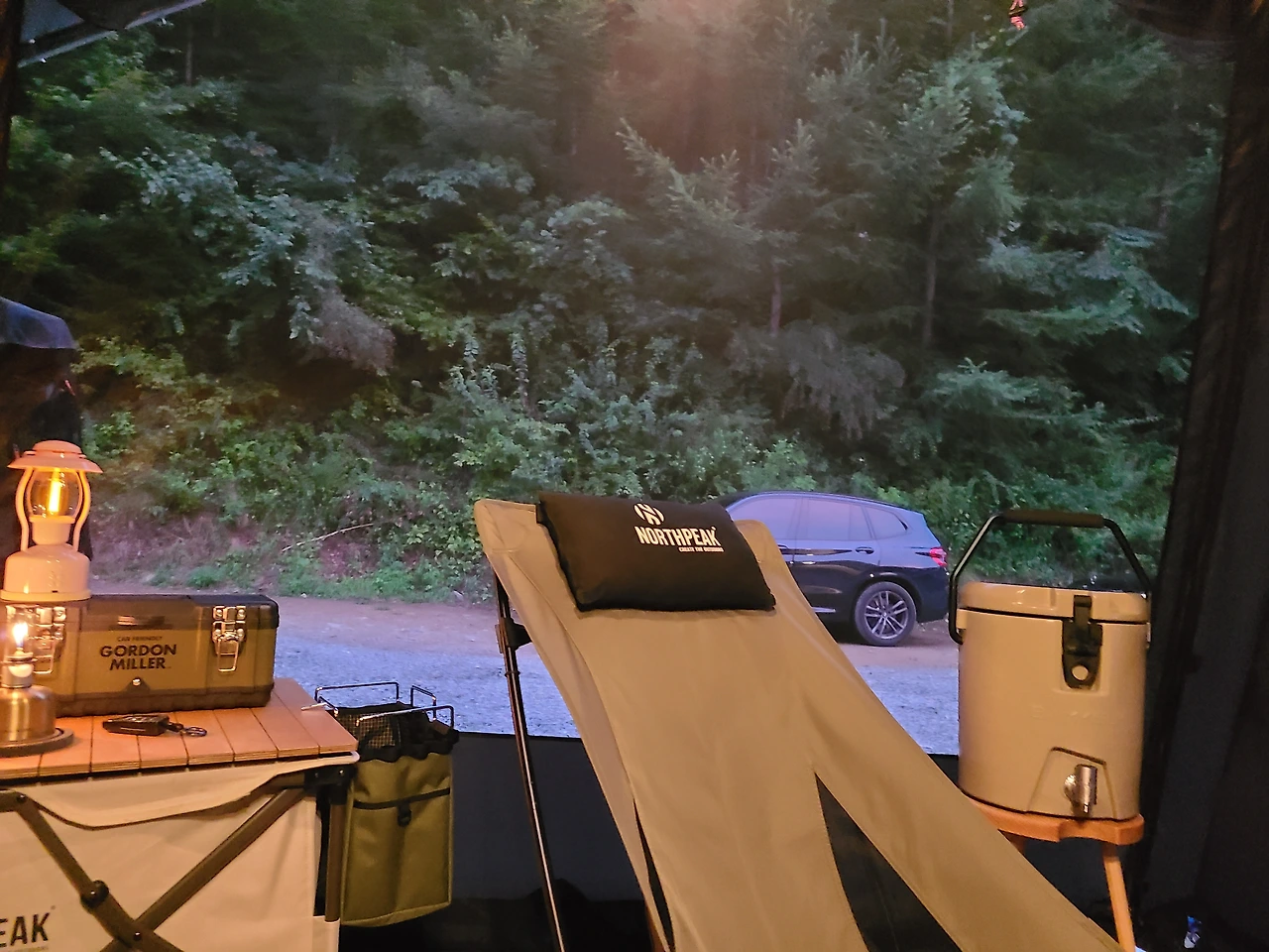 문배골 캠핑장은 울창한 나무숲 가운데 자리 잡고 있다. 나무 숲이 햇빛을 가려주는지 8월 여름 같지 않고 선선했다. 사이트는 나란히 한 줄로 되어 있고 의자에 앉으면 눈앞에 나무 숲과 마주 보며 힐링할 수 있어 좋았다. 선선한 바람까지 불어 오니 선풍기의 배터리가 다 되어 꺼졌는데도 더운지 몰랐다.