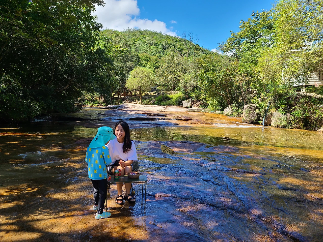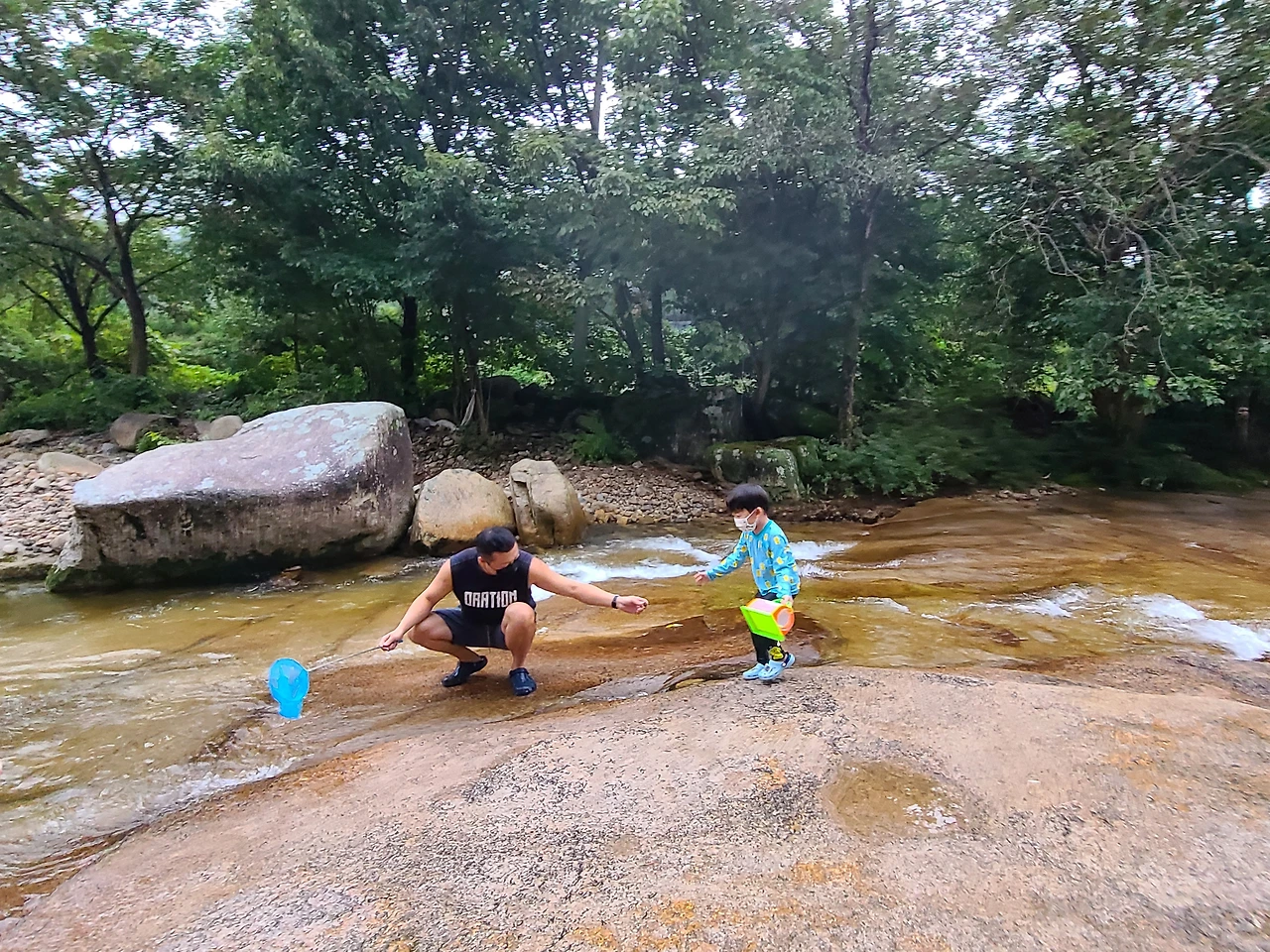 이끼가 있는 곳은 미끄러워서 아쿠아 슈즈를 신은 준이는 평평한 바위에 앉아서 물고기를 잡으려고 왔다 갔다 했다. 우리가 있던 위치는 수심이 깊지 않아 준이가 앉아도 서서 돌아다녀도 안심이 되었다.