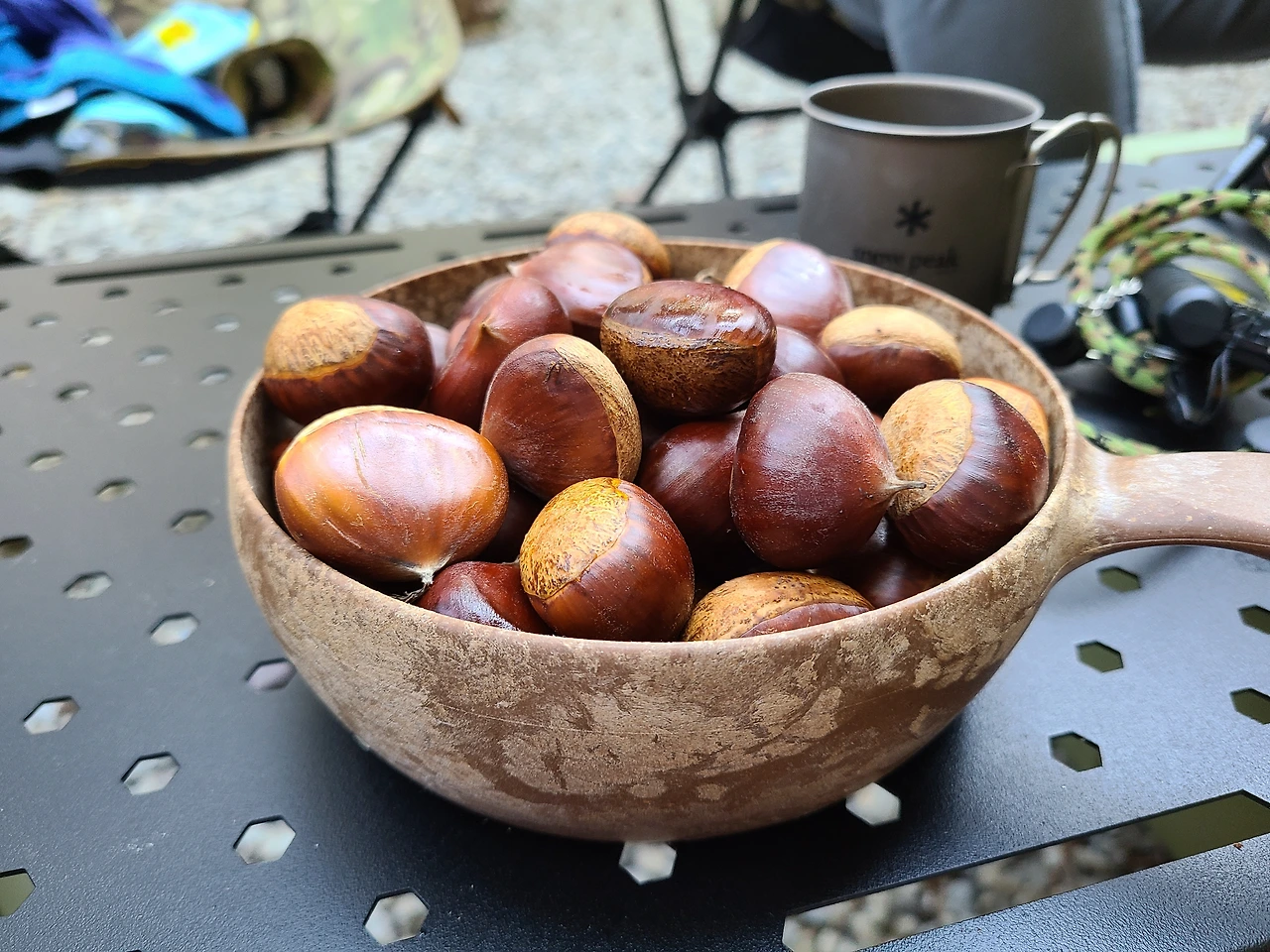 나는 옆에서 낮에 계곡 근처에서 주운 알밤에다 칼집을 냈다. 나중에 숯불에 넣어서 구워 먹을 생각을 하니 신났다. 어릴 적 시장 입구에서 할머니가 작은 화로에 구워서 파는 군밤이 정말 맛있었다. 그 군밤만큼 맛있길 바랬다.