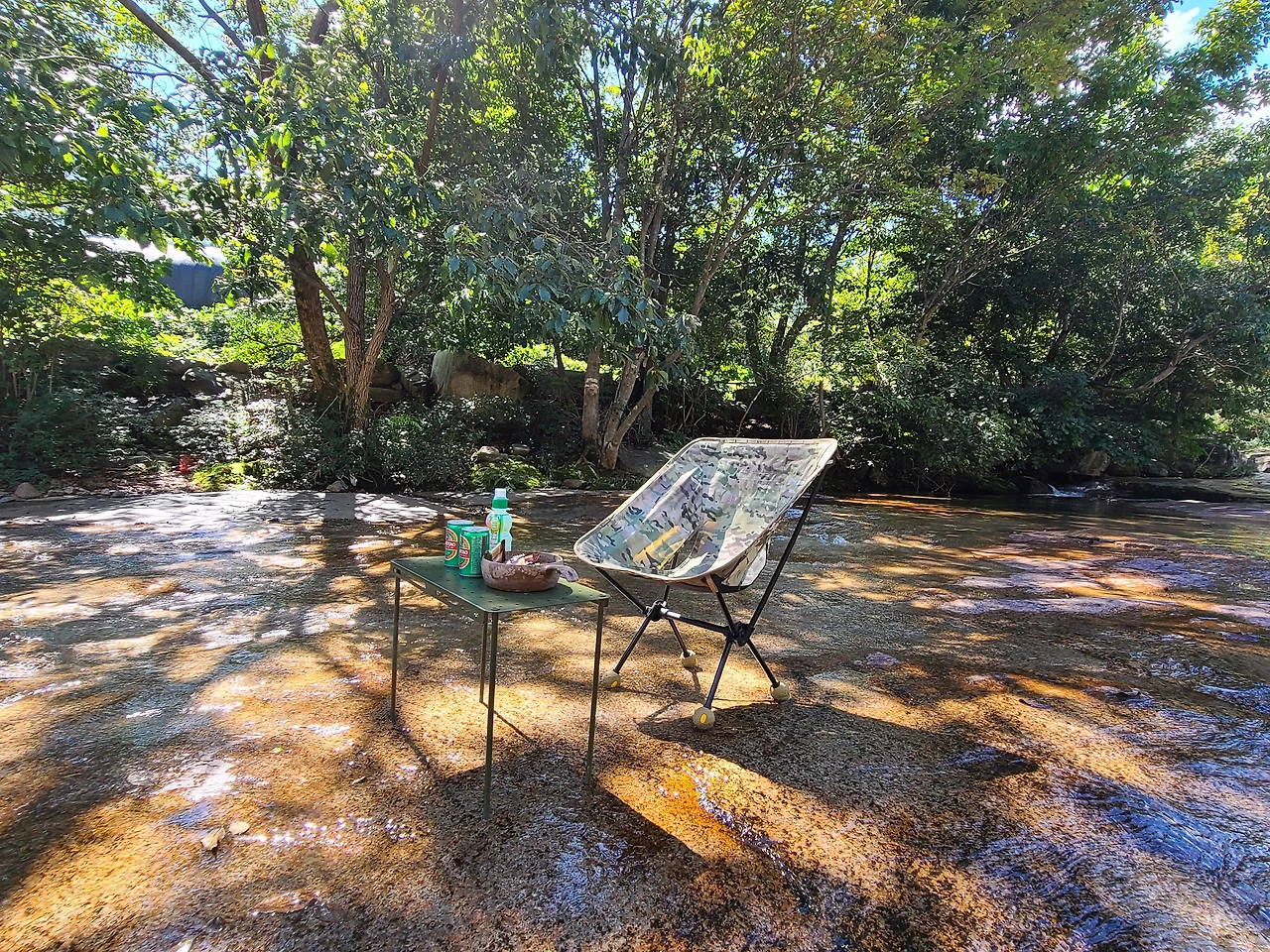 반들반들하고 평평한 바위와 깨끗하게 맑은 물이 흐르며 작은 물고기 떼가 지나다니고 있었다.