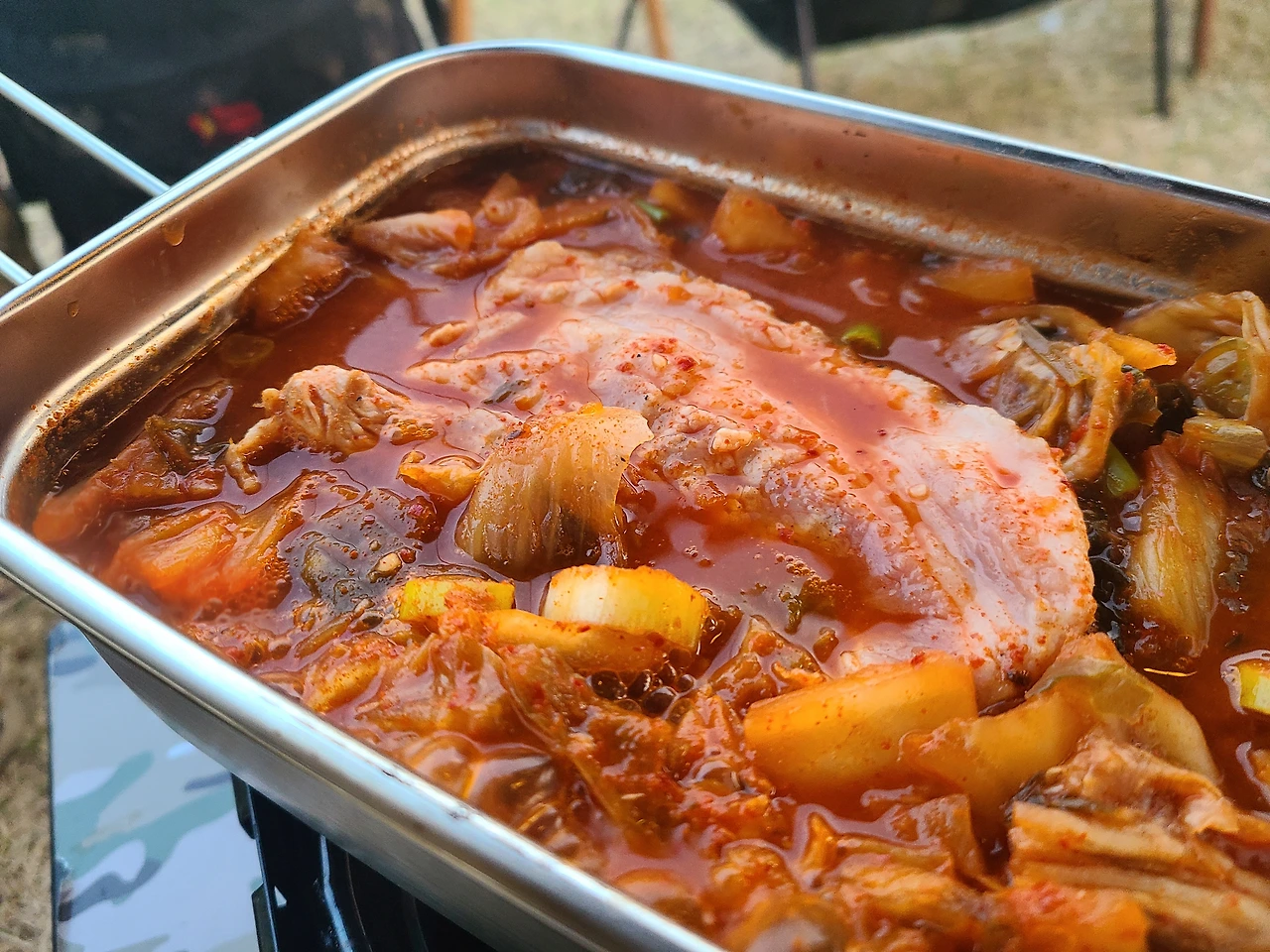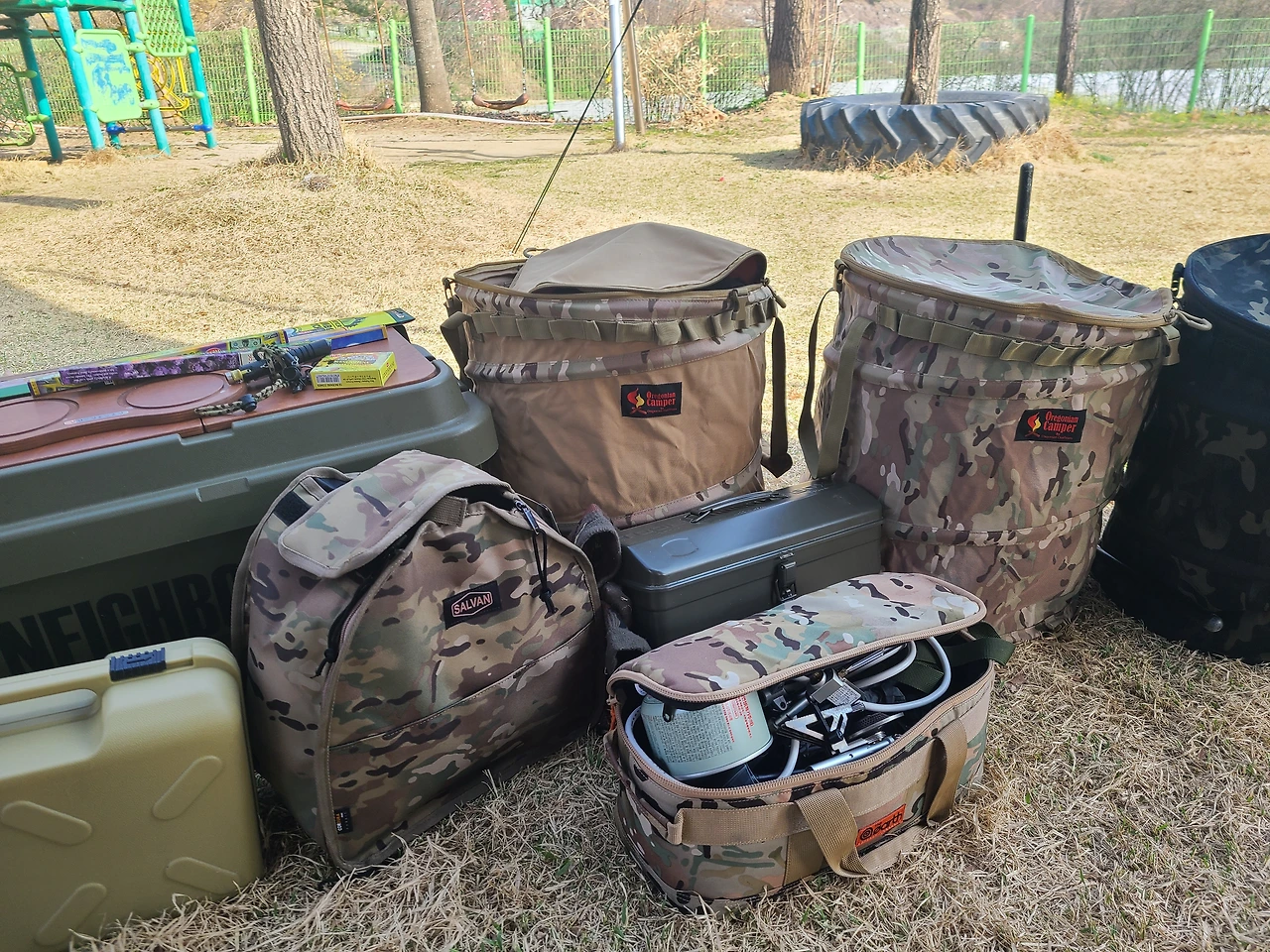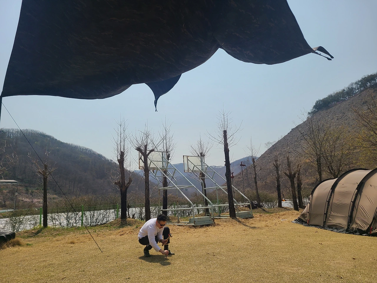 아이들이 동물들에게 먹이를 주는 동안 어른들은 텐트를 피칭하고 점심밥 준비를 했다. 바람이 많이 불어 타프를 피칭하는 데 애를 먹었지만 이젠 뭐 베테랑 아닌가. 장비 세팅은 그냥 뚝딱이다.
