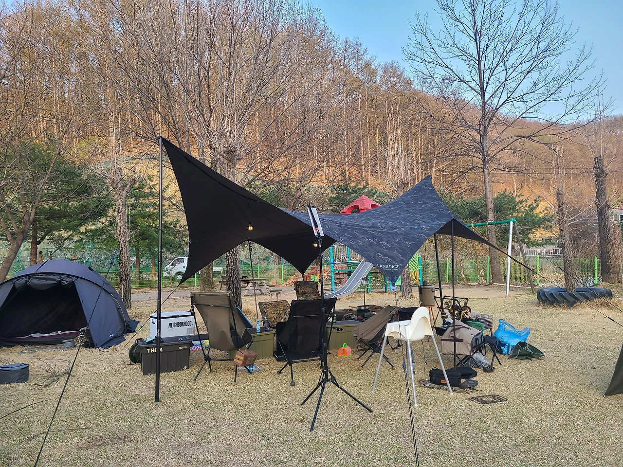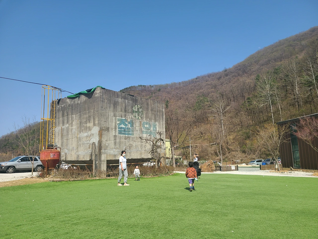 잔디 존에서만 차박이 가능해서 우린 다른 선택지가 없었지만 꽤 마음에 드는 사이트였다. 간격이 정해지 않아서 넓게 사용 가능했고 놀이터가 바로 앞에 있고 농장도 맞은편에 있으니 아이들이 놀기 좋은 동선이었다. 놀이터 때문에 시끄럽고 농장 냄새가 난다고 비추하는 글이 있어서 걱정했었는데 우리가 온 날에는 놀이터에 놀러 오는 아이들이 몇 명 없었고 사실 우리 아이들이 제일 시끄러웠다. 농장 냄새는 바람이 부는 방향에 따라 났다가 안 났다가 했는데 나중에는 적응이 되어서 냄새를 느끼지 못했다.