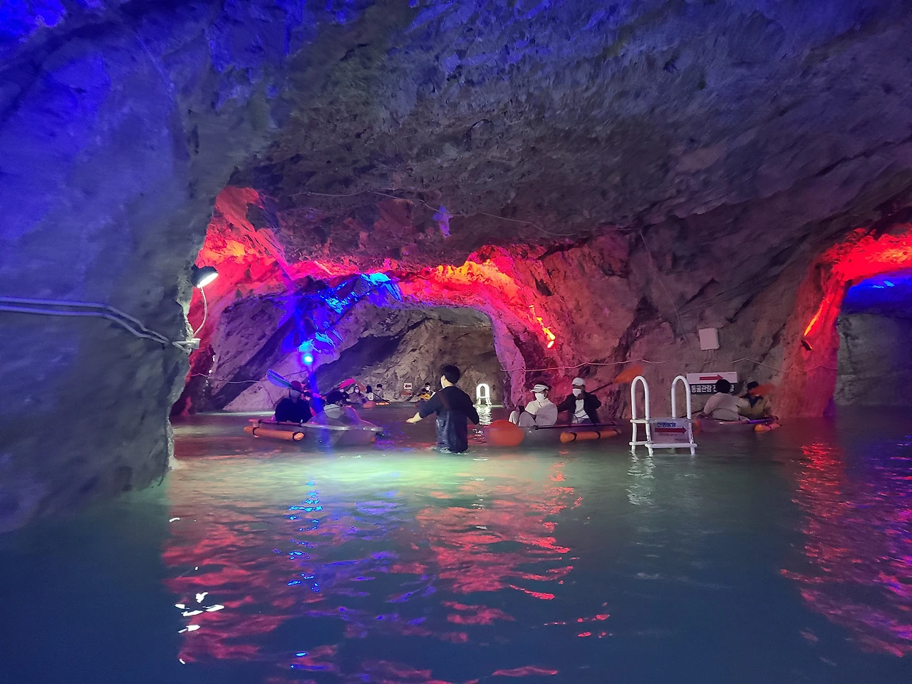 투명 카약은 동굴 마지막 코스에 있었다. 가족 단위로 한 번에 타다 보니 생각보다 대기는 많이 하지 않았다. 정해진 위치를 한 바퀴 돌아서 오는 코스인데 맨 뒷자리에 앉은 아빠만 노를 젓다 보니 카약이 뜻대로 움직이 않아서 더 재미있었다. 준이는 신이 나서 웃고 또 웃었다. 동굴이니 소리가 울리고 그것이 또 신기한지 또 웃었다. 물 밑에 악어가 나올 것 같다고 무섭다고 하면서도 또 웃었다. 그런 준이가 사랑스러워 우리 모두 웃었다. 10분 채 안 되는 짧은 코스였지만 탐험가가 된 것 같은 기분에 새로운 체험이라 충주에 왔다면 꼭 활옥동굴에서 투명 카약은 꼭 타야 된다고 추천한다.