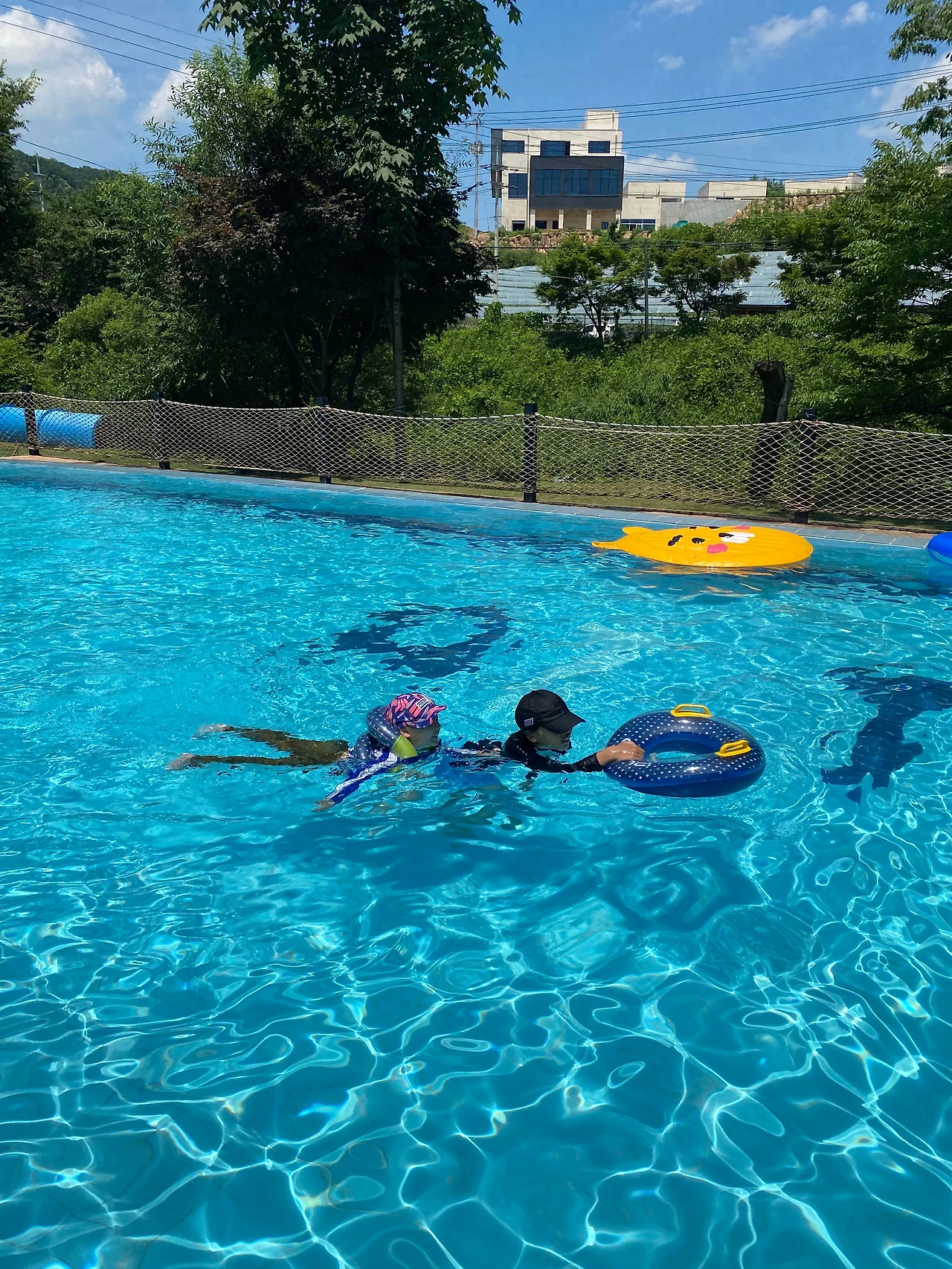 수심이 120cm라서 준이 발이 닿이진 않지만 튜브 끼고 발장구 치는 걸 좋아하는 아이라 깊은 곳을 더 좋아했다. 더위를 피해 풍덩 들어간 수영장에서 어른, 아이 할 것 없이 정말 신나게 놀았다.