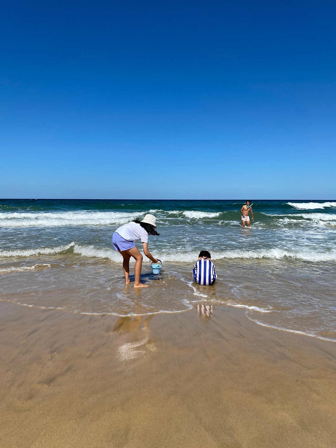 암튼 카메라는 넣어두고 준이의 모래 양동이를 빌려서 조개를 줍기 시작했다. 잠깐 주웠는데도 양동이 가득 채울 만큼 조개가 많았다. 내일 아침에 조개탕으로 해장할 생각에 흐뭇한 미소가 지어졌다.