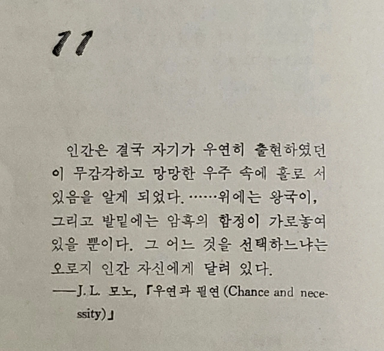 J. L. 모노의 '우연과 필연'이라는 교차로적 해석에서 나는 한수산이 빌린 개인적 가치보다 지금을 사는 현상적인 뒤틀림을 바라본다. 사랑에 처절한 40여 년 전의 이야기에서 내가 사는 시대로 넘어왔다.