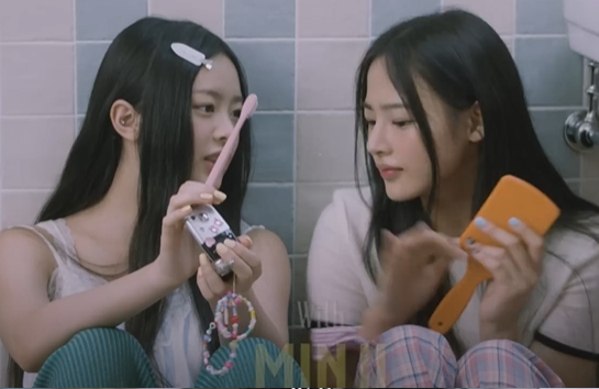 2) 여기에 더해 얼마 전 뉴진스 <Ditto> 뮤직비디오에서 버니즈를 특정 인물화 한 반희수 유튜브 채널에 홈비디오 카메라로 제작된 <OMG> 뮤직비디오가 올라온 것도 언급할 수 있다. 이 뮤직비디오는 90년대 뉴진스와 같은 반 친구였던 반희수가 이제서야 뒤늦은 약속을 지켜낸 결과물이다. 그 시절 그때의 뉴진스에 보내는 비애감 젖은 뮤직비디오의 엔딩 크레딧에서 우리가 마주하는 것은 지금-여기의 뉴진스 멤버들의 이름이다.