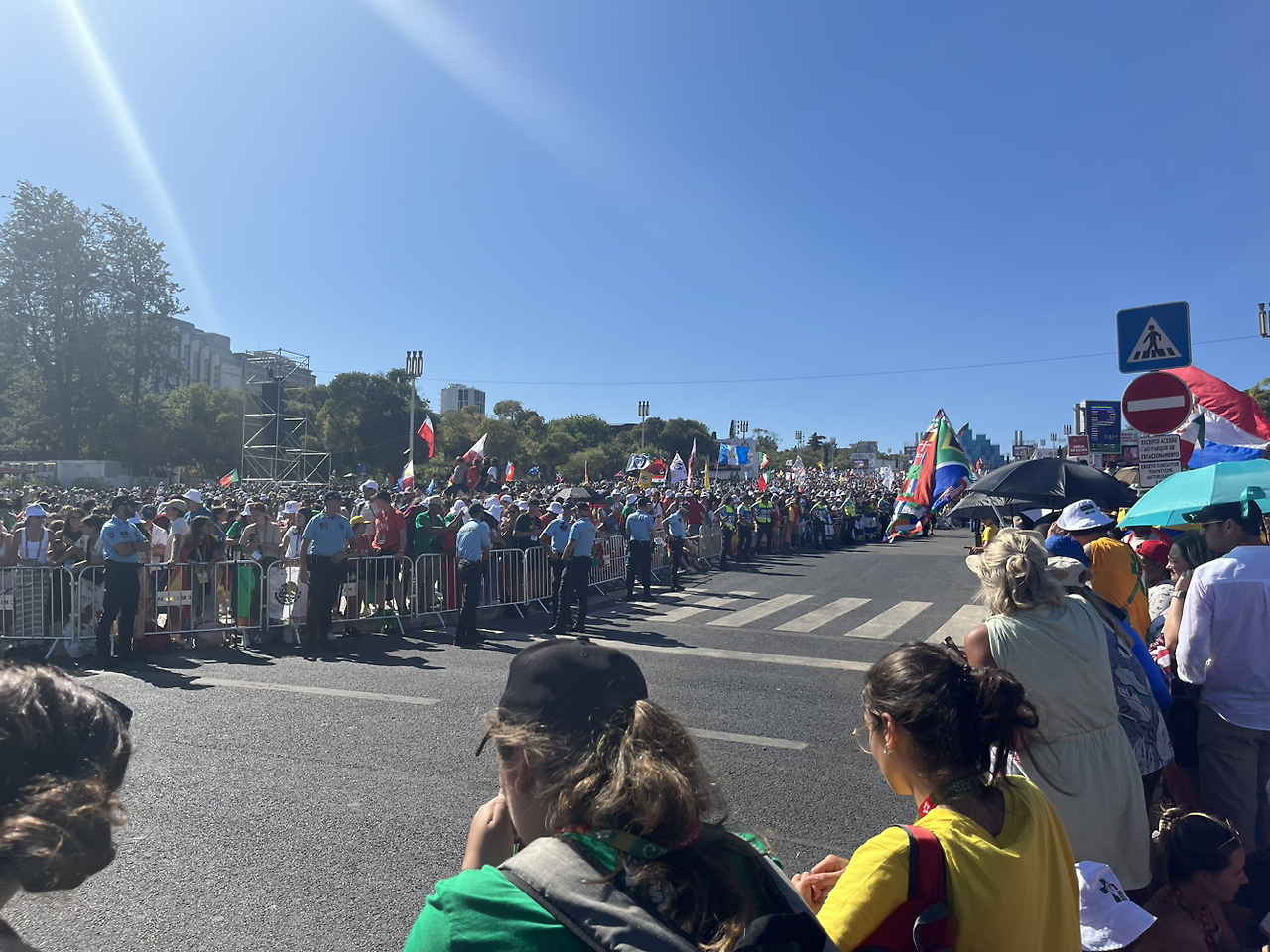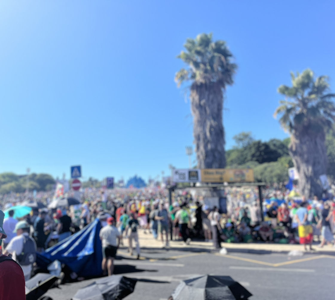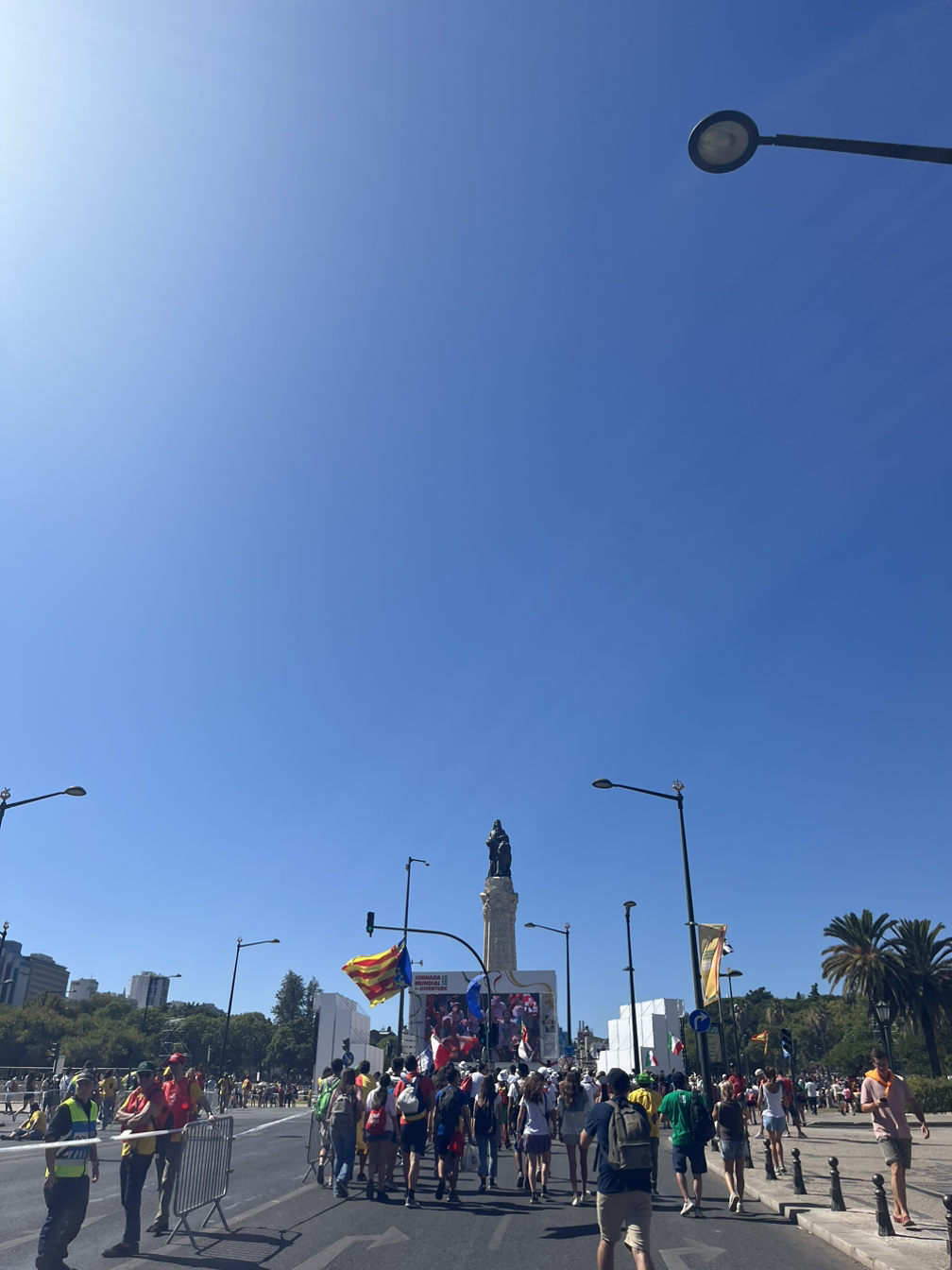 후련하게 고해성사를 마치고 이동하려는데 지하철역이나 버스 정류장은 이미 사람들이 넘쳐난다는 소식이 들어왔다. 결국 팀을 나누어 택시로 이동하기로 했다. Bolt로 콜을 하는 데도 잘 안 잡혀서 기다리다가 다행히 한 팀도 빠짐없이 택시를 잡아타고 출발했다. Parque Eduardo VII 인근은 역시나 버스 정류장이나 지하철역이 폐쇄돼서 근처에 내려 입구까지 걸어갔다. 나, 단짝, 그리고 우리 조원 한 명이 같이 움직였는데 공원에 제일 먼저 도착했다. 입구 쪽 잔디에 미리 자리잡은 우리 교구 청년들도 보였다.