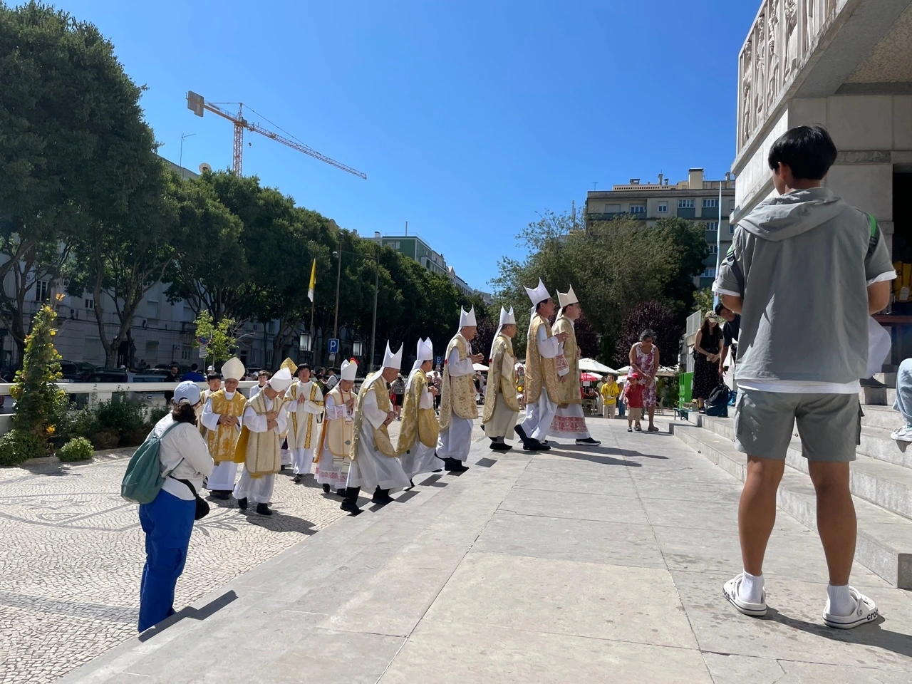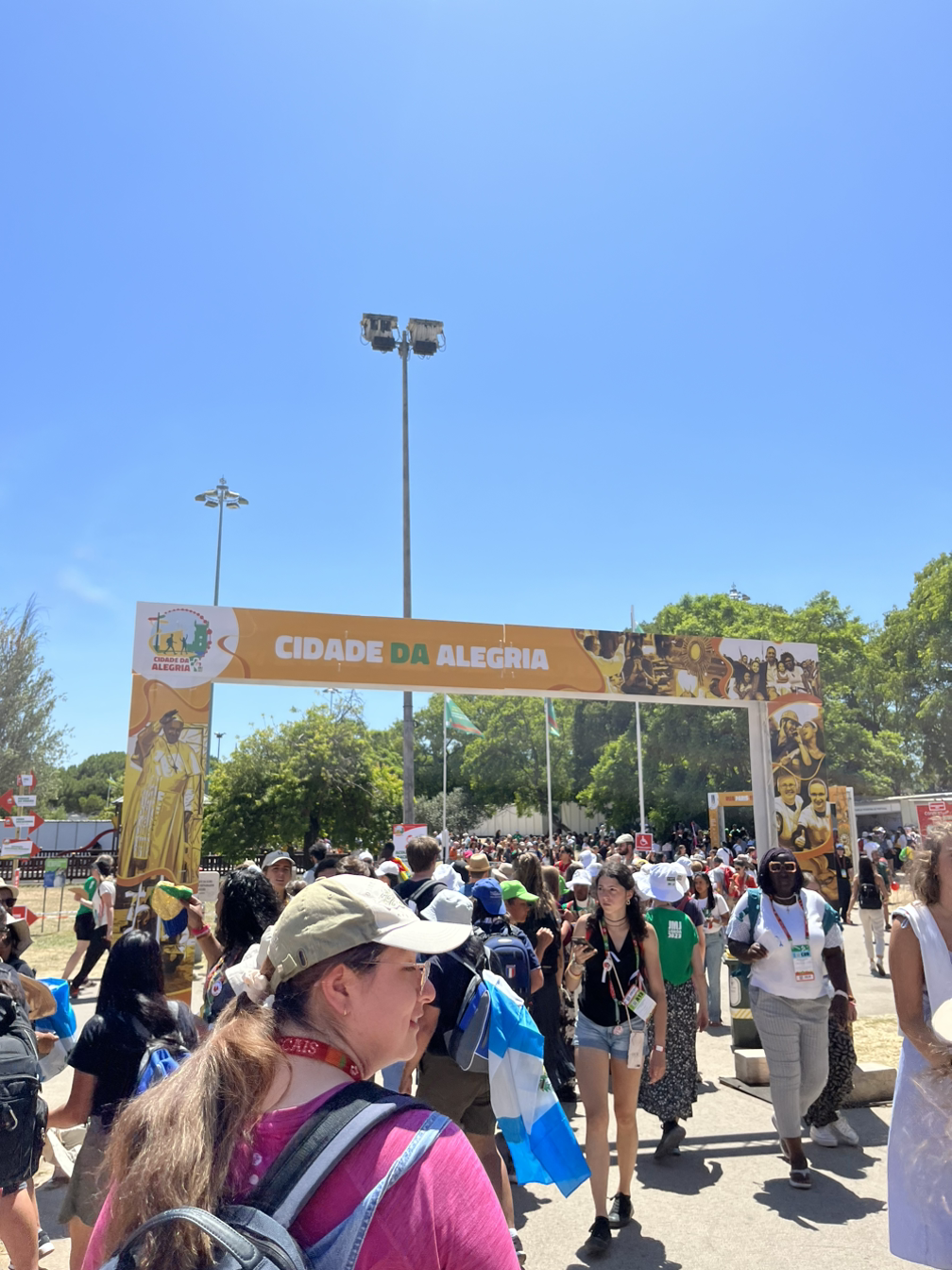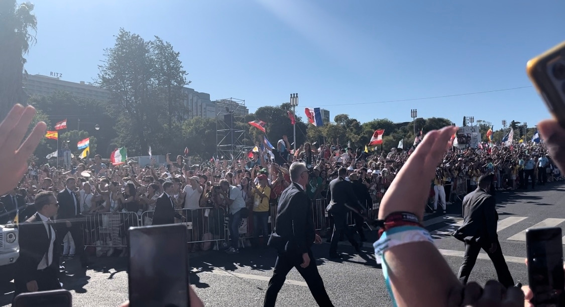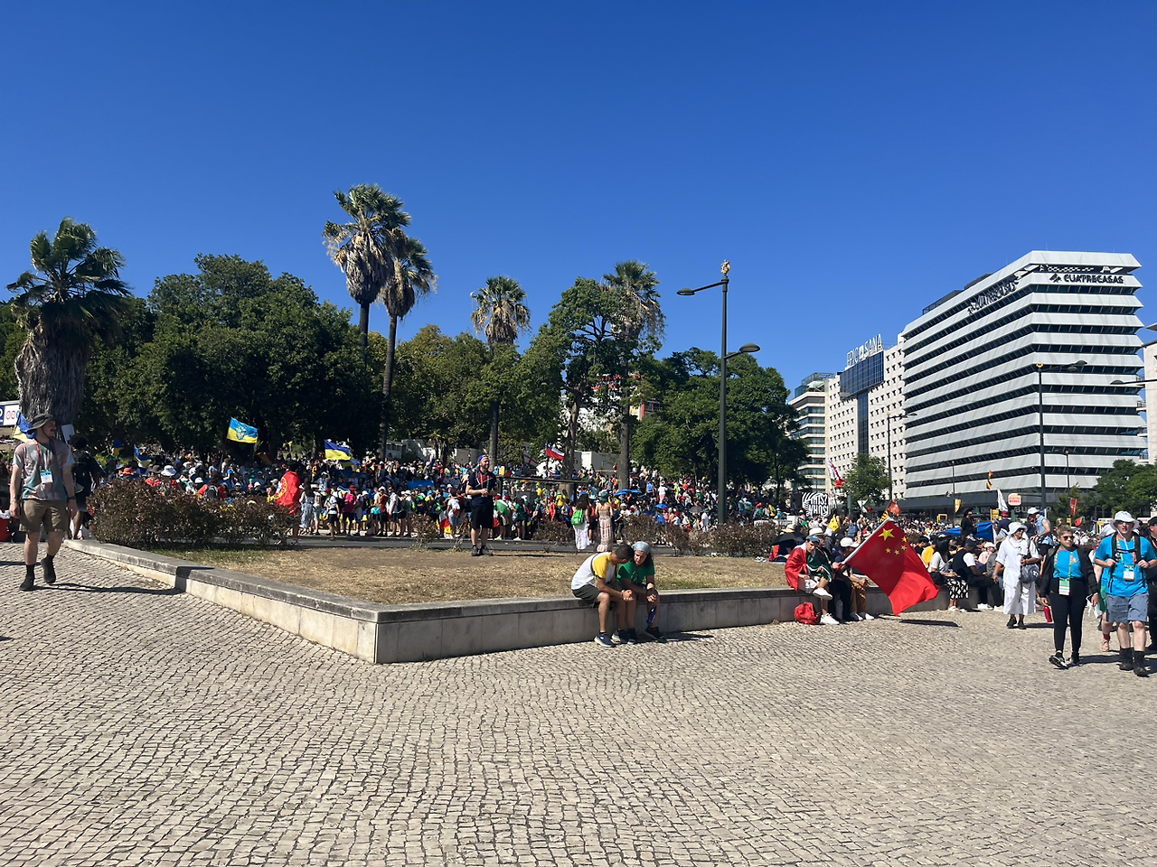 후련하게 고해성사를 마치고 이동하려는데 지하철역이나 버스 정류장은 이미 사람들이 넘쳐난다는 소식이 들어왔다. 결국 팀을 나누어 택시로 이동하기로 했다. Bolt로 콜을 하는 데도 잘 안 잡혀서 기다리다가 다행히 한 팀도 빠짐없이 택시를 잡아타고 출발했다. Parque Eduardo VII 인근은 역시나 버스 정류장이나 지하철역이 폐쇄돼서 근처에 내려 입구까지 걸어갔다. 나, 단짝, 그리고 우리 조원 한 명이 같이 움직였는데 공원에 제일 먼저 도착했다. 입구 쪽 잔디에 미리 자리잡은 우리 교구 청년들도 보였다.