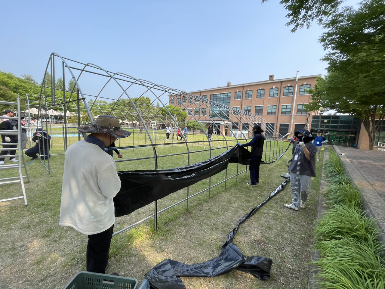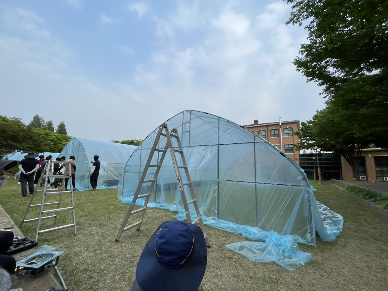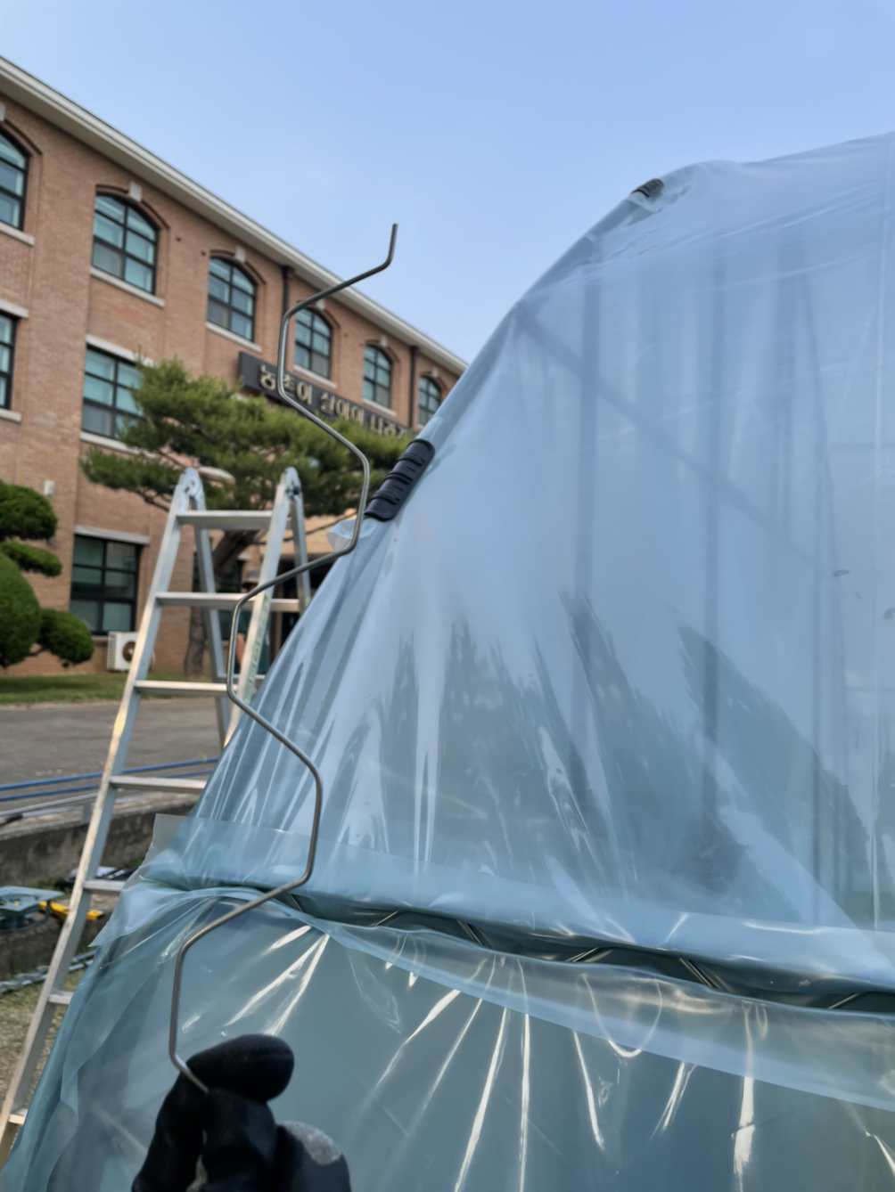 오후부터는 다시 하우스를 지었다. 가로장 파이프를 달고, 피스와 조리개를 이용해 고정했다. 비닐을 고정할 패드를 달고, 환기구를 달 구멍도 만들어주었다. 하우스 옆면 아래에는 검은색 처마 비닐을 달아주었다. 그러고는 대망의 천정 비닐을 설치했다. 엄청나게 커다란 비닐을 여러 사람이 마치 연날리기 하듯 촤라락 펼쳐서 하우스에 덮어주었을 때 묘한 쾌감과 희열이 느껴졌다. 그러고는 비닐을 패드에 스프링으로 눌러 끼어서 고정해 주었다. 열심히 했는데 이렇게 하고 나니 벌써 6시가 되었다. 무려 5시간이 순삭 되었다.