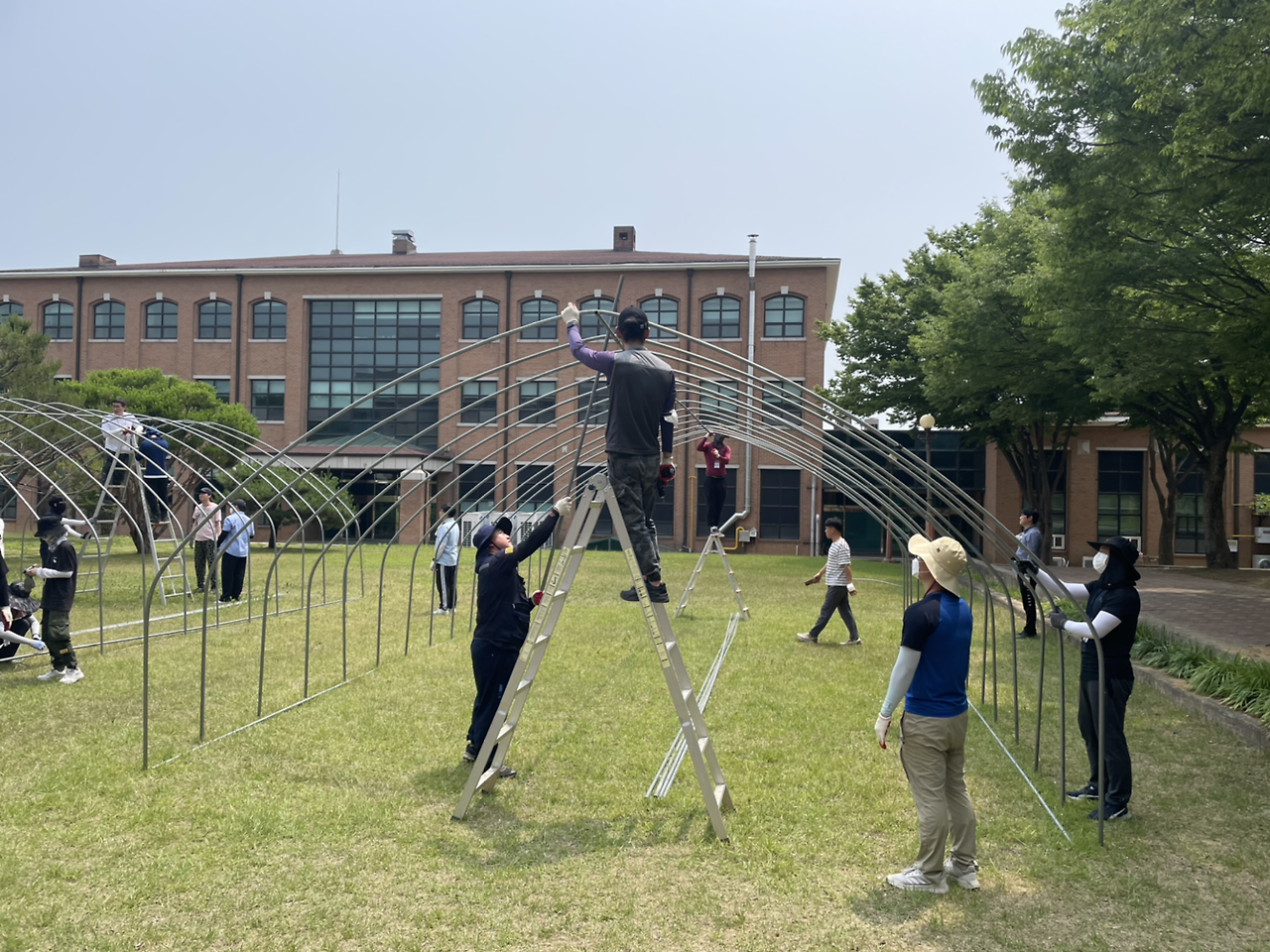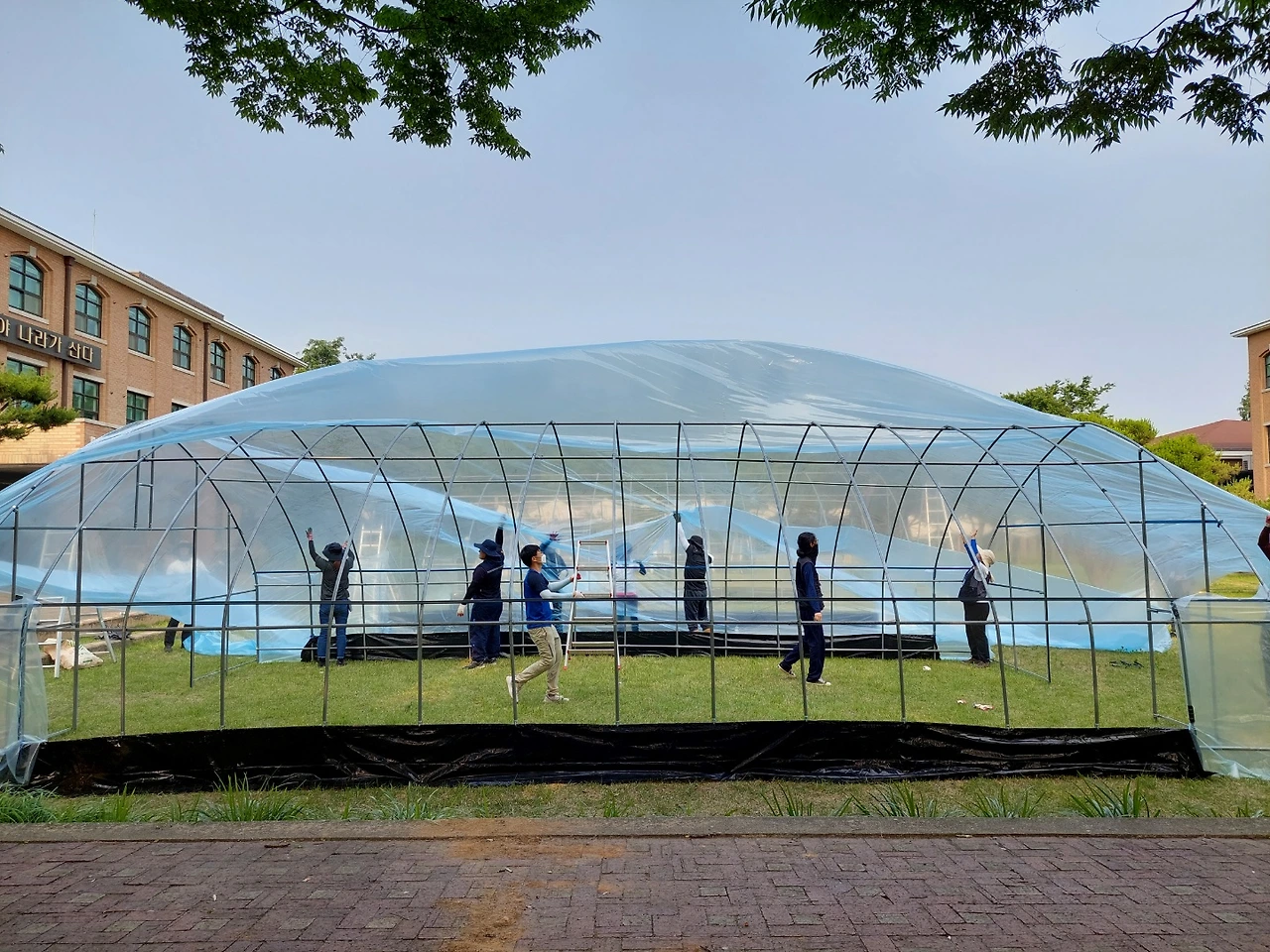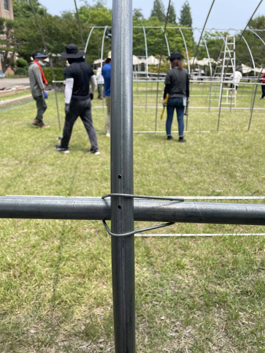 오후부터는 다시 하우스를 지었다. 가로장 파이프를 달고, 피스와 조리개를 이용해 고정했다. 비닐을 고정할 패드를 달고, 환기구를 달 구멍도 만들어주었다. 하우스 옆면 아래에는 검은색 처마 비닐을 달아주었다. 그러고는 대망의 천정 비닐을 설치했다. 엄청나게 커다란 비닐을 여러 사람이 마치 연날리기 하듯 촤라락 펼쳐서 하우스에 덮어주었을 때 묘한 쾌감과 희열이 느껴졌다. 그러고는 비닐을 패드에 스프링으로 눌러 끼어서 고정해 주었다. 열심히 했는데 이렇게 하고 나니 벌써 6시가 되었다. 무려 5시간이 순삭 되었다.
