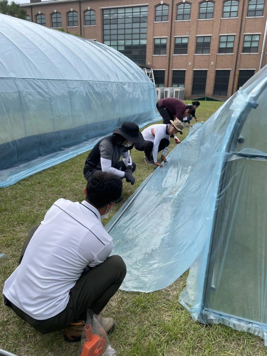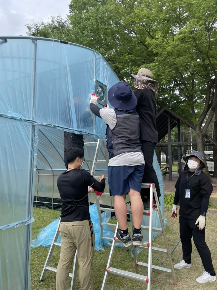 오늘은 비닐하우스의 옆의 비닐을 열고 닫을 수 있는 개폐기(비닐하우스를 언제부터 이렇게 열고 닫았는지 신기하다.), 뜨거운 공기와 습기를 배출하는 환기구, 출입문을 설치했다. 이 세 가지를 달고 나니 실습용이긴 하지만 그래도 그럴듯한 비닐하우스가 만들어졌다. 뿌듯한 마음이 들었다. 역시 거대한 무언가를 만들면 가슴이 웅장해진다. 그리고 그만큼의 동료애가 생긴 것 같았다.