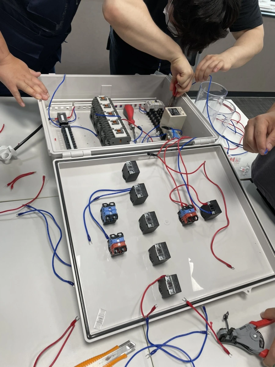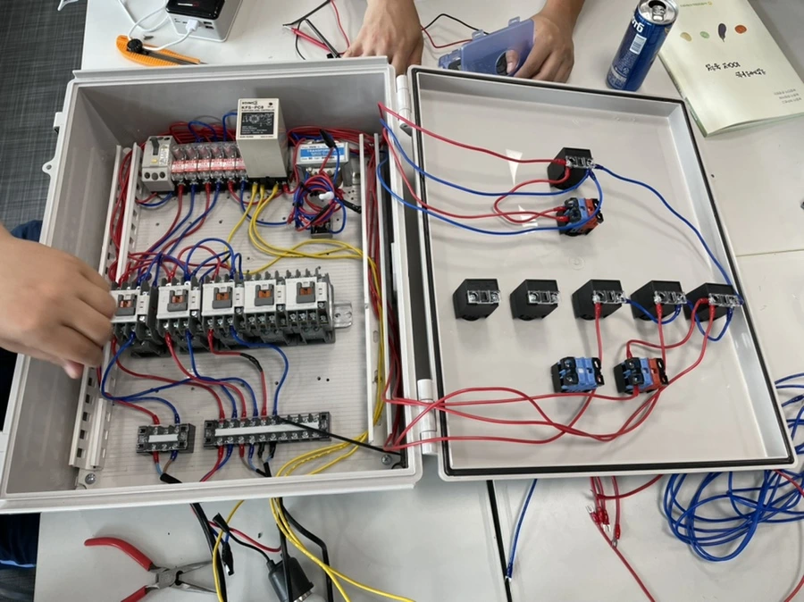 교수님이 그려주신 설계도대로 천천히 하나하나 부품을 조립하기 시작했다. 그리고 단자를 잘 맞춰서 전선을 잘라서 연결해주었다. 전선의 길이를 조금은 여유 있게 잡아놓고, 피복을 벗기고 드러난 금속 선에 연결하기 쉽도록 집게발 모양으로 생긴 연결고리, 터미널을 붙여주었다. 전선의 피복을 벗기는 와이어 스트리퍼, 터미널 연결을 쉽게 도와주는 터미널 압착기가 있어서 작업이 수월했다. 역시 작업은 도구빨이라는 것을 깨닫게 된다. 하지만 이 계전함 작업을 할 때에는 전자드릴은 오히려 사용하지 않는 게 좋았다. 그 정도로 힘들게 작업할 필요도 없었을뿐더러 과하게 힘을 줬을 경우 플라스틱이 부서지거나 나사선이 마모되어 오히려 고정이 안 되는 상황도 있다고 했다. 뭐든 적당한 수준을 찾는 것이 중요하다.