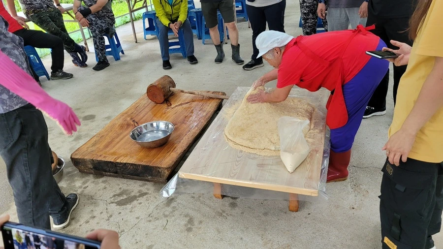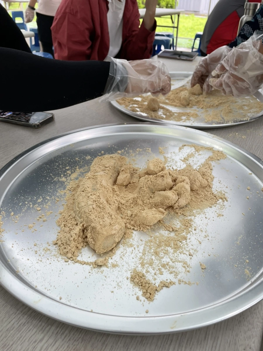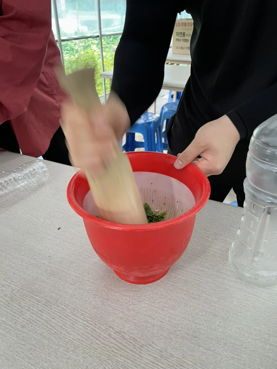 미리내 마을에서는 마을 자체 체험활동으로 천연 세정제, 비누를 만든다. 잎을 비비기만 해도 거품이 나는 식물과 향이 나는 허브 잎을 이용해서 만드는 것이었다. 절구로 빻고 끓여서 만들었다. 작업이 끝나고는 인절미를 만들어 먹었다. 따뜻하니 맛있었다.
