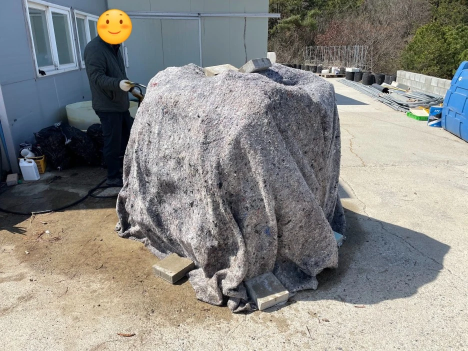 비닐 위에 삽으로 흙을 뿌려준다.